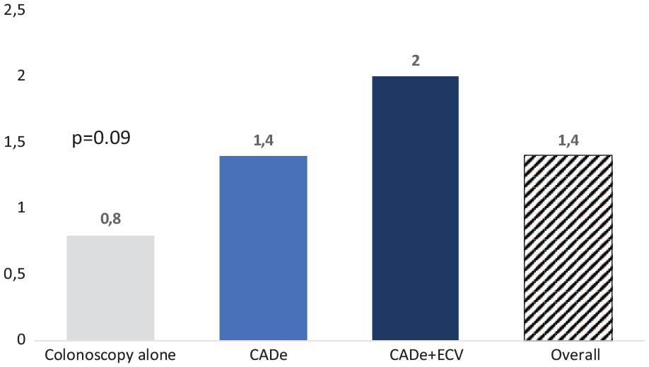 There was no significant difference in the average number of adenomas detected per colonoscopy: 2 ± 2.3 adenomas in the coupled group versus 0.8 ± 1.4 in the colonoscopy-only group and 1.4 ± 2 in the CADe group,