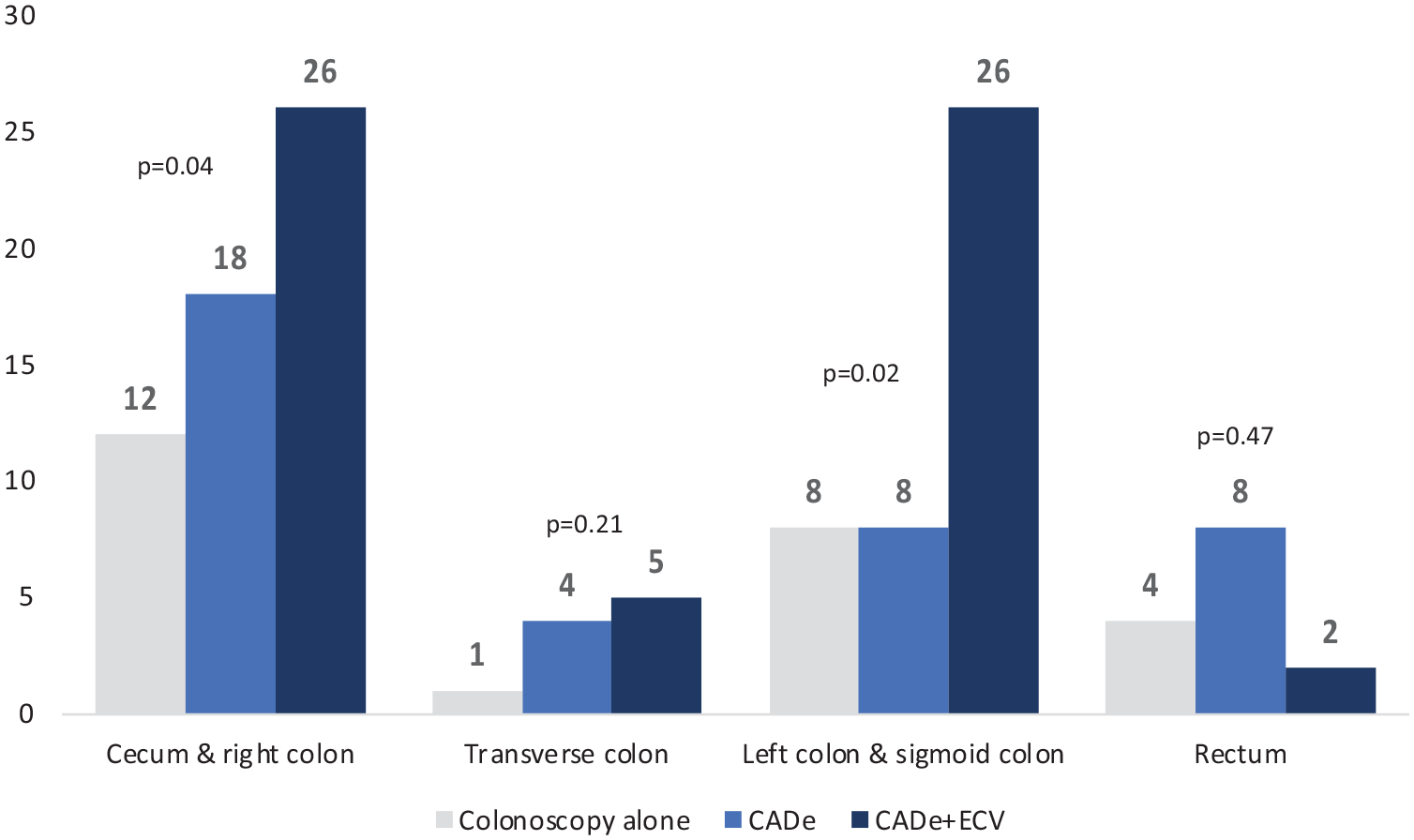 In the cecum and right colon, the number of polyps detected was significantly higher in the CADe + ECV group with 26 polyps, compared to 18 and 12 polyps detected in the CADe and colonoscopy alone groups, respectively (