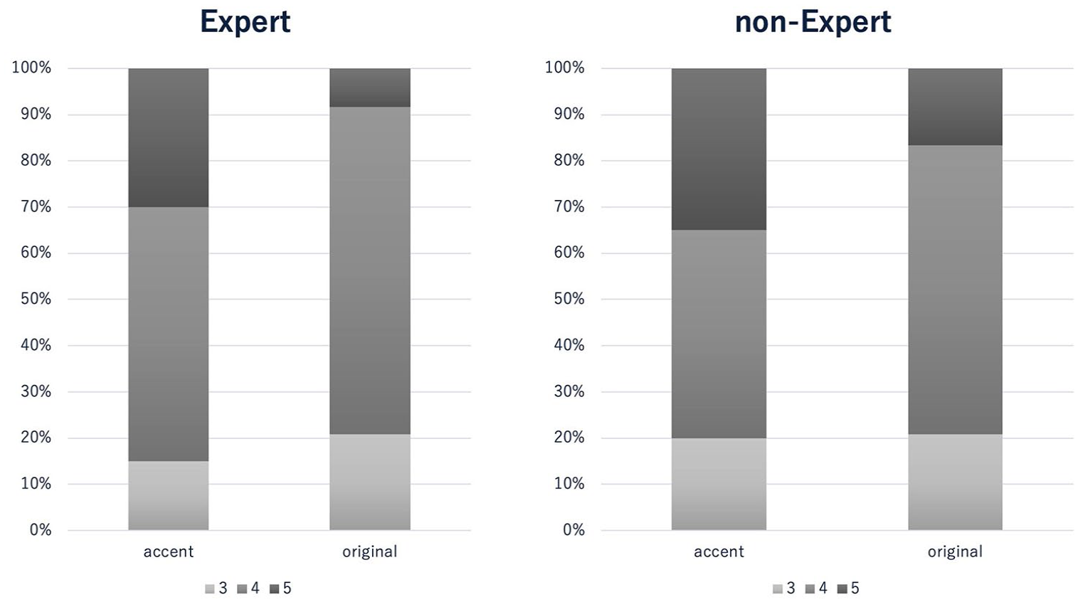For the dilation device, visibility scores are significantly higher in the Accent group (4.47 and 4.58 in the expert and trainee observers, respectively) than in the Original group (2.68 and 2.53, respectively;