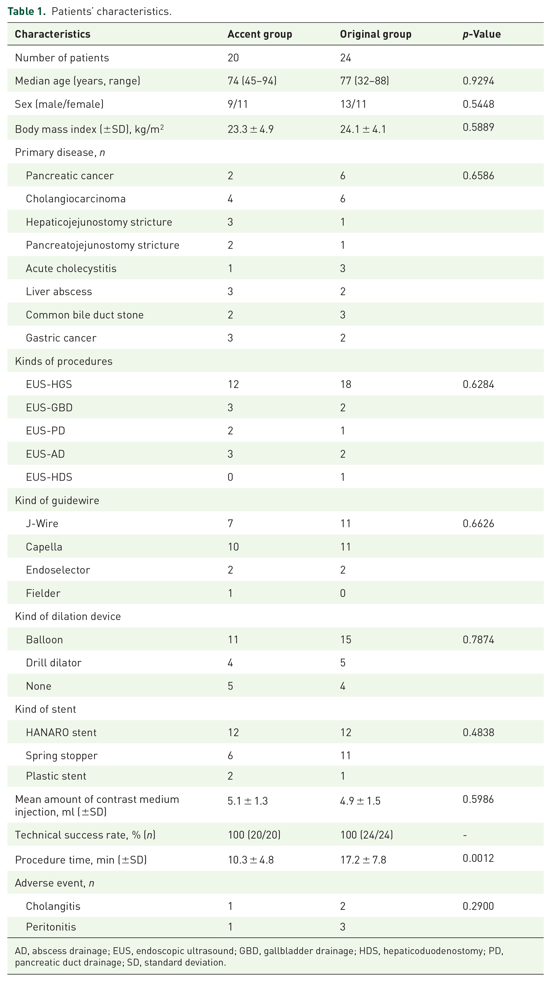 AD, abscess drainage; EUS, endoscopic ultrasound; GBD, gallbladder drainage; HDS, hepaticoduodenostomy; PD, pancreatic duct drainage; SD, standard deviation.