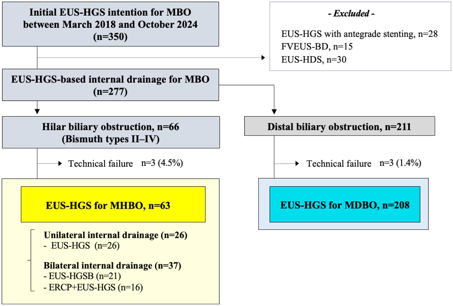 Unresectable patients who underwent initial EUS-HGS because of ERCP failure were recruited. Distal biliary stenosis or Bismuth types I and II–IV were defined as MDBO and MHBO, respectively. We defined EUS-HGS for MDBO as the control and analyzed the outcomes for MHBO.
