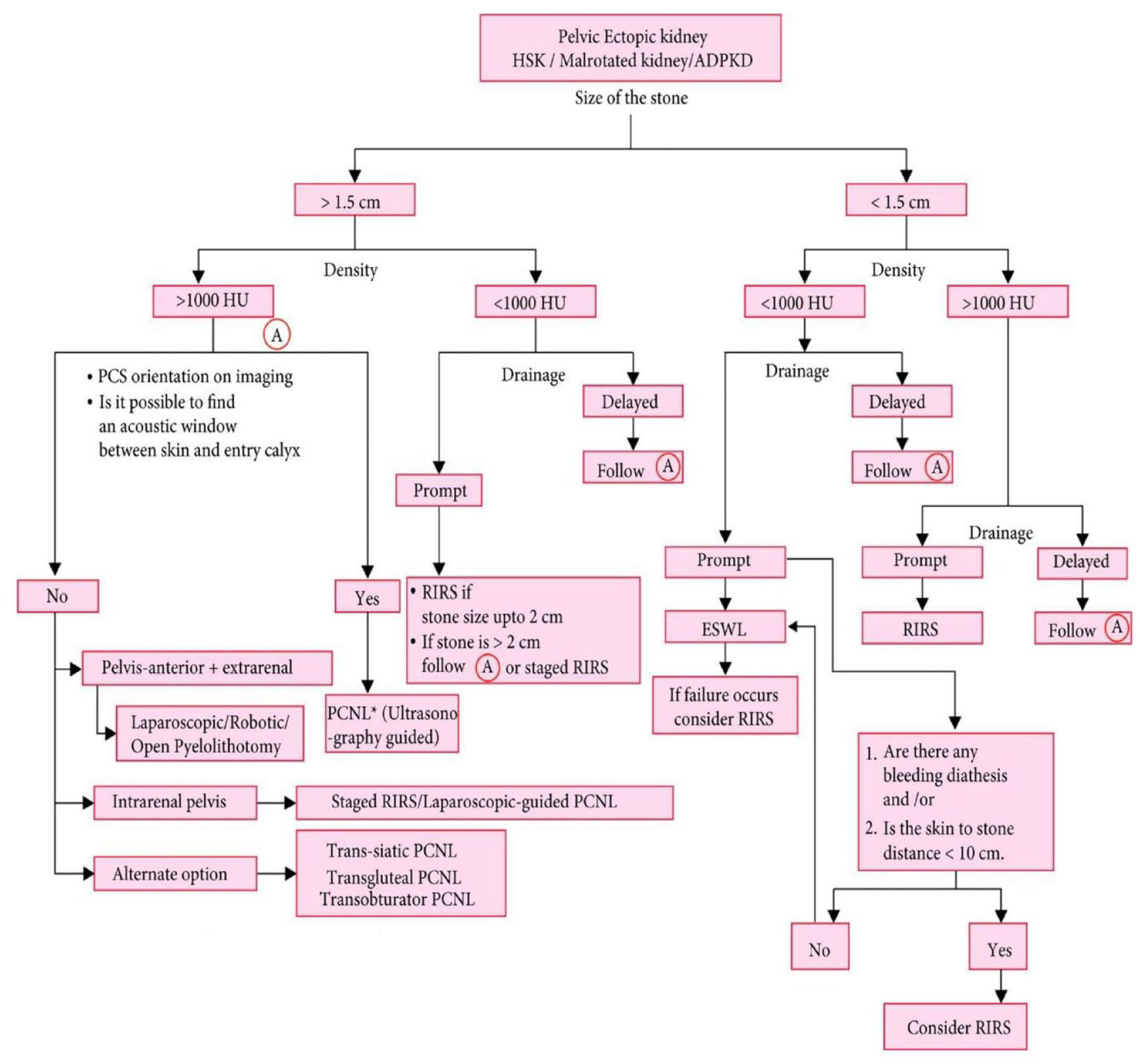 ADPKD, adult polycystic kidney disease; CD, Clavien–Dindo complications; EK, ectopic kidney; ESWL, extracorporeal shock wave lithotripsy; HSK, horseshoe kidneys; LP, laparoscopic pyelolithotomy; MRK, Mal-rotated kidneys; PCNL, percutaneous nephrolithotomy; PK, pelvic kidney; RIRS, retrograde intra-renal surgery; SFR, stone-free rate; URS, ureterorenoscopy.