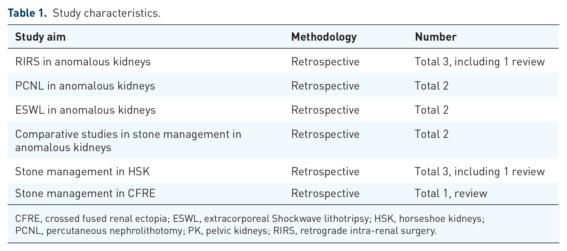 CFRE, crossed fused renal ectopia; EK, ectopic kidney; ESWL, extracorporeal shock wave lithotripsy; HSK, horseshoe kidneys; MRK, Mal-rotated kidneys; PCNL, percutaneous nephrolithotomy; PK, pelvic kidney; RIRS, retrograde intra-renal surgery; SFR, stone-free rate; URS, ureterorenoscopy.