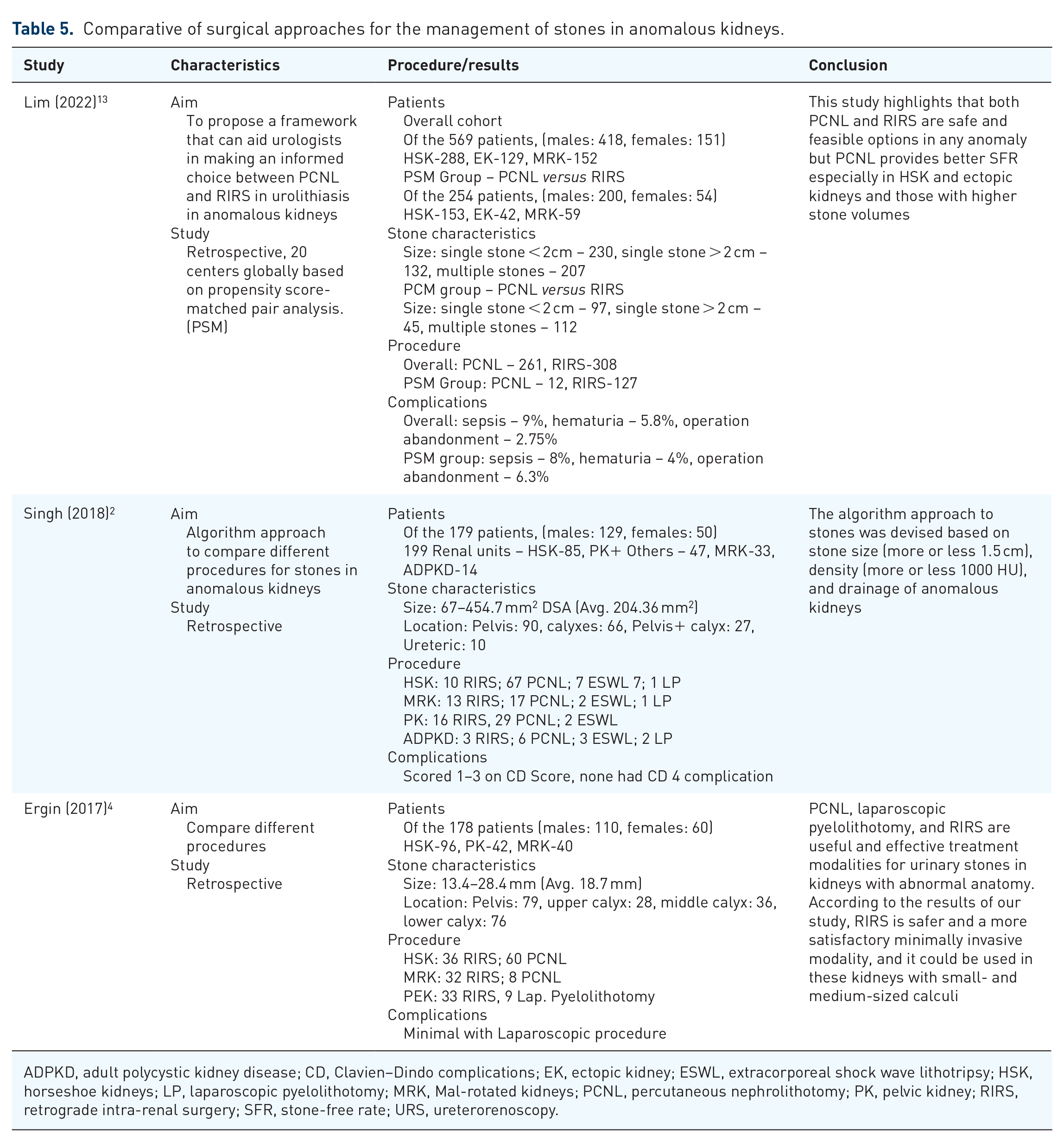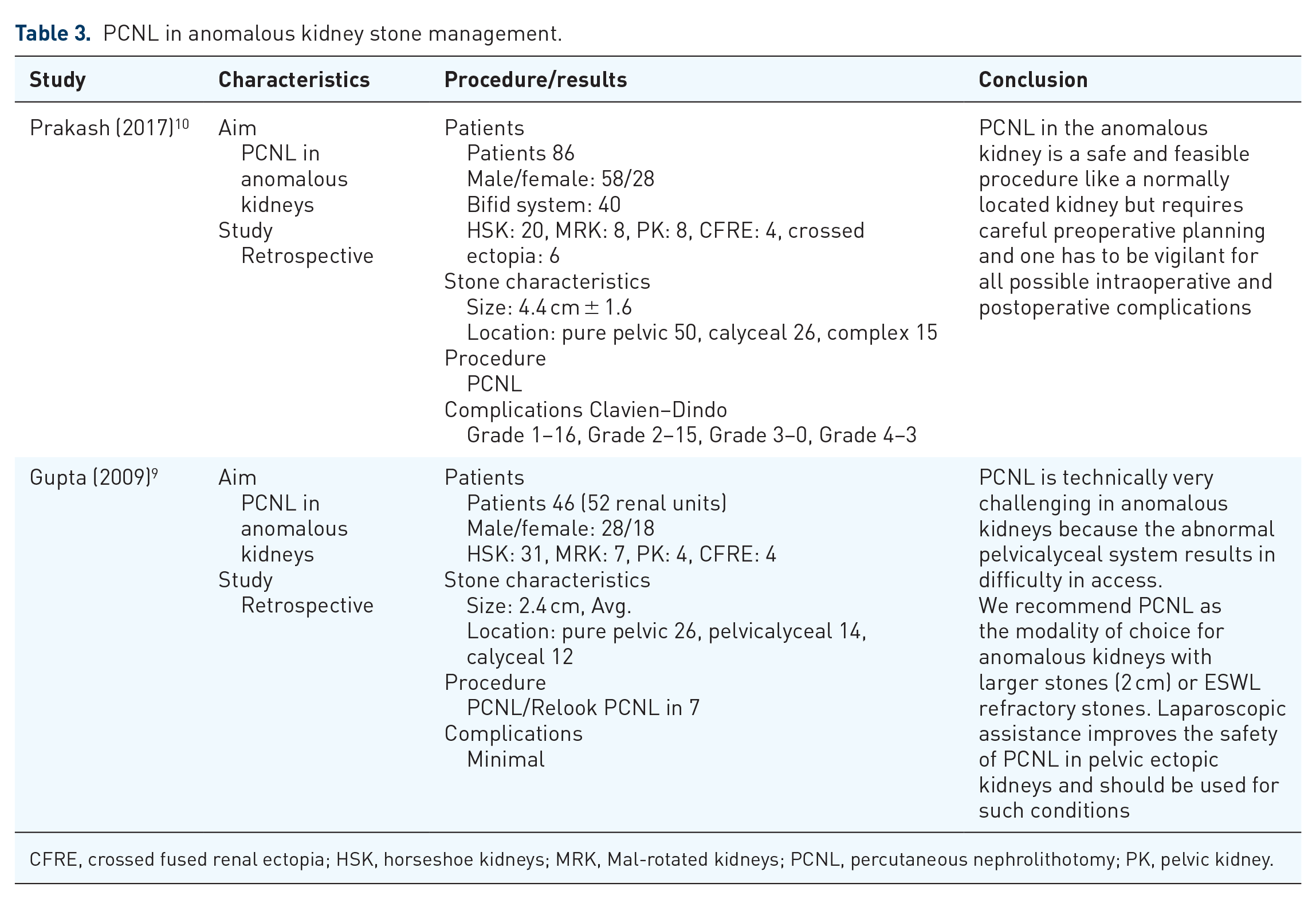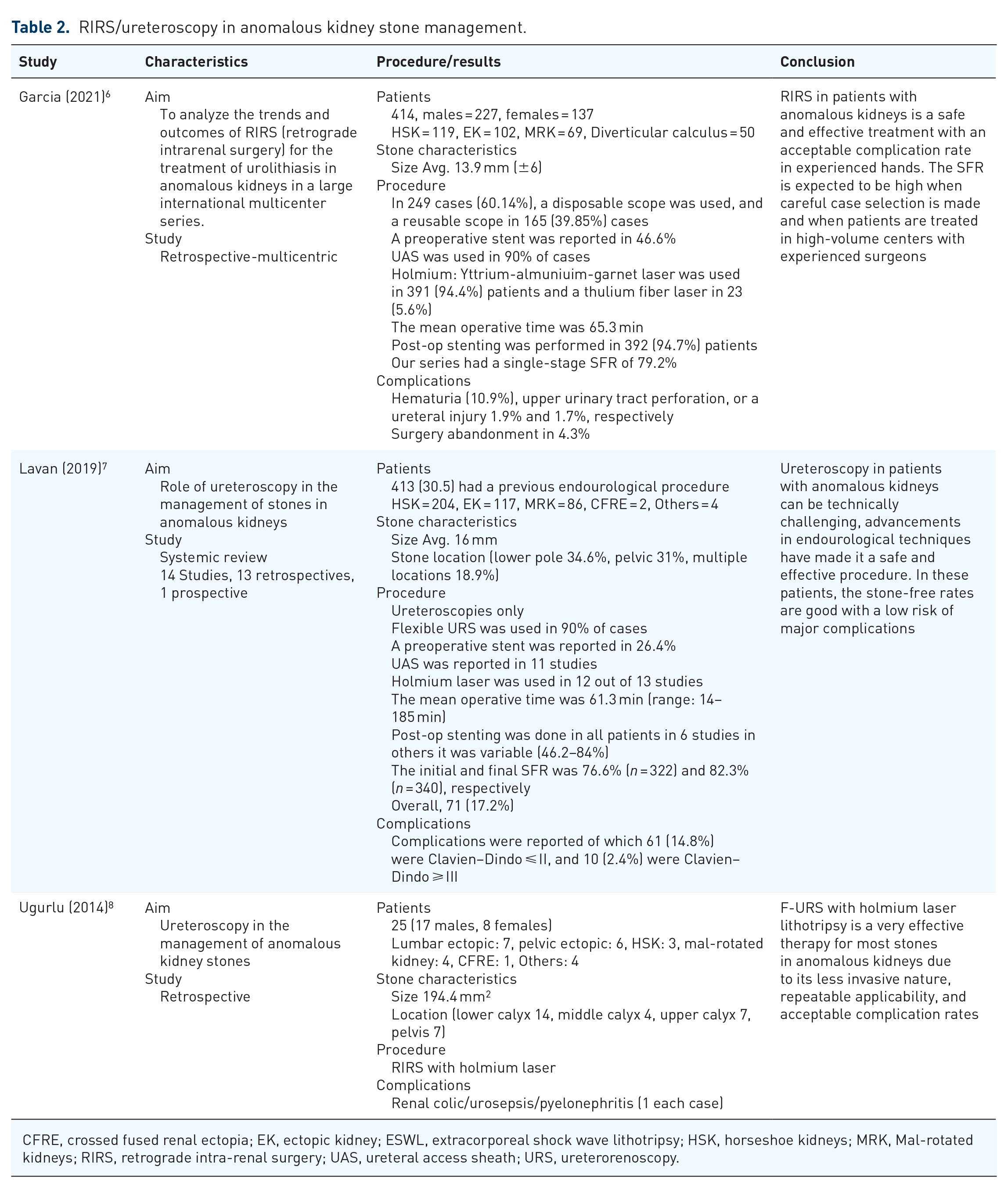 Percutaneous nephrolithotomy (PCNL) is often used in surgical procedures in patients with anomalous kidneys; however, it often requires careful preoperative planning and may even need close collaboration with other branches like radiology. Although the complication rate may be more than RIRS and in PKs, laparoscopic-assisted PCNL may be indicated, PCNL is the choice of treatment in stones with sizes >2 cm.9,10 Summarized results are shown in Table 3.