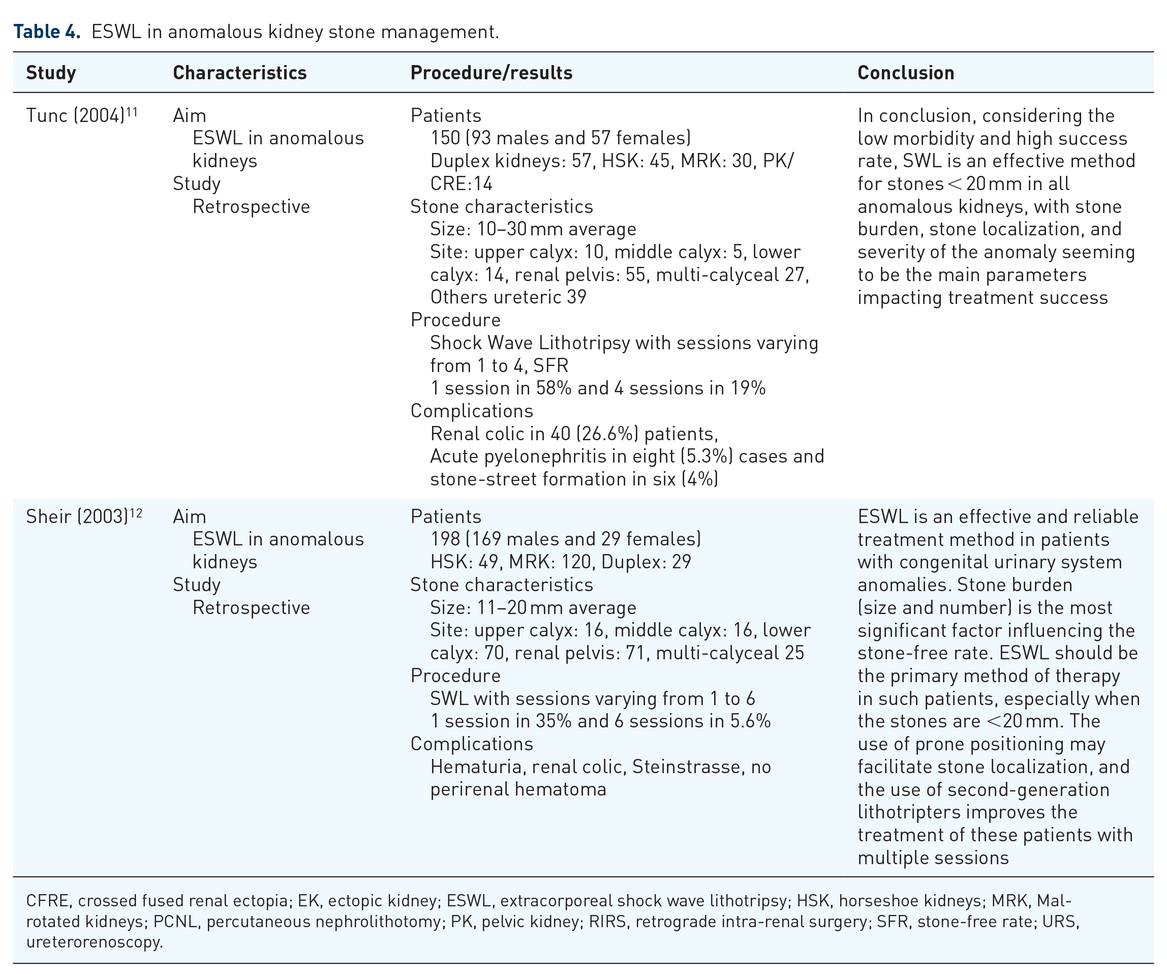 Extracorporeal shockwave lithotripsy (ESWL) is still one of the modalities being used in patients with stones in anomalous kidneys. Studies have revealed that it can be used effectively in stones with <20 mm but the number of sessions may range somewhat between 1 and 6.11,12 Renal colic was reported to be the most common complication in these two studies. In addition to stone size, stone burden, and location, drainage along with the degree of the anomaly has been found to impact treatment success with ESWL.11,12 Summarized results are given in Table 4.