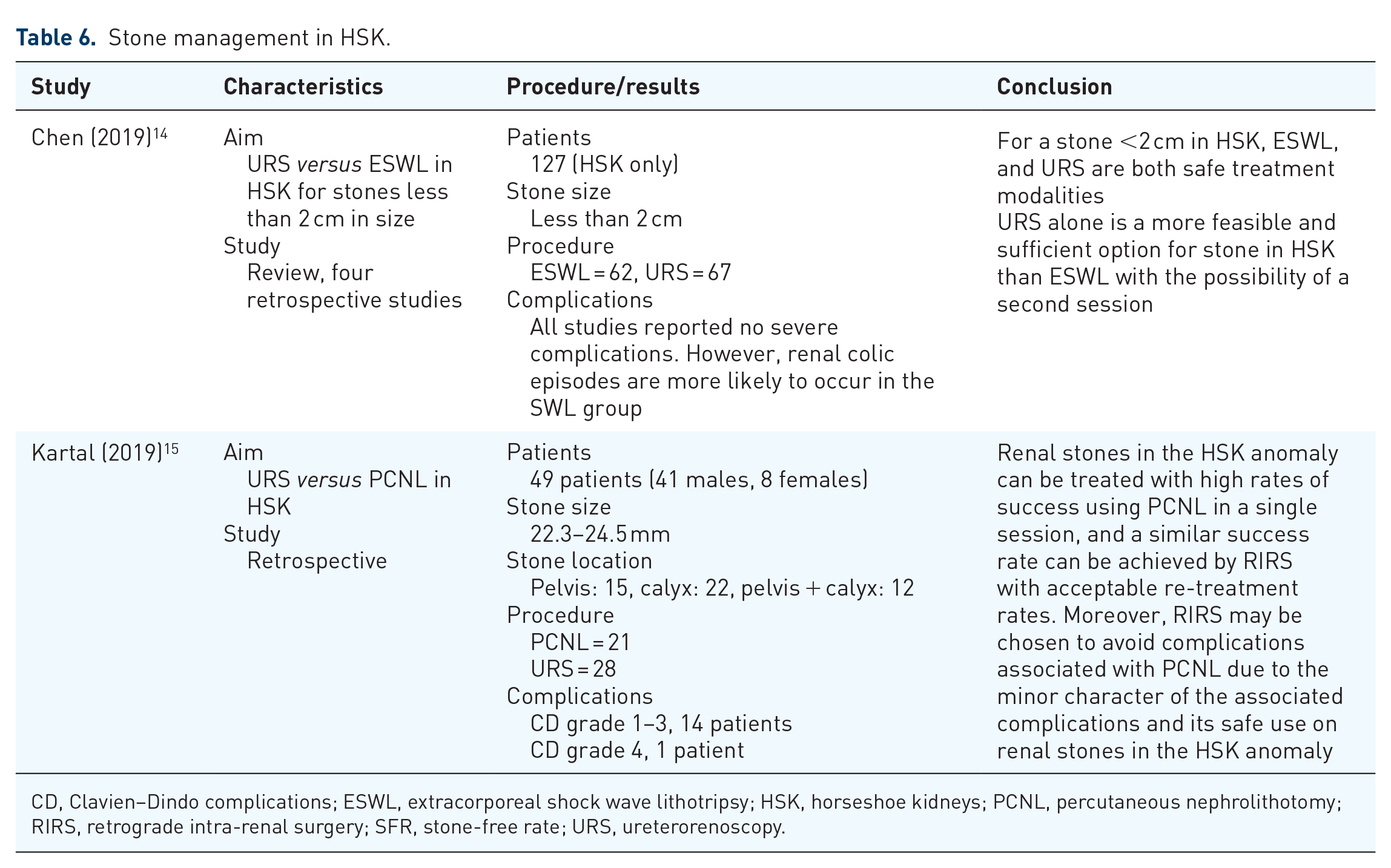 CD, Clavien–Dindo complications; ESWL, extracorporeal shock wave lithotripsy; HSK, horseshoe kidneys; PCNL, percutaneous nephrolithotomy; RIRS, retrograde intra-renal surgery; SFR, stone-free rate; URS, ureterorenoscopy.