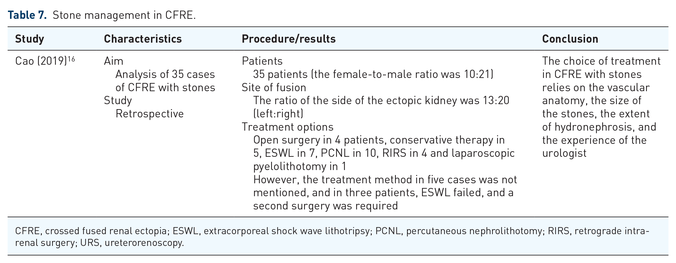 A single study, reviewing 35 CFRE cases with stones reported in the literature, has found that all methods have been used for management including open surgery as well. 16 Summarized results are given in Table 7.
