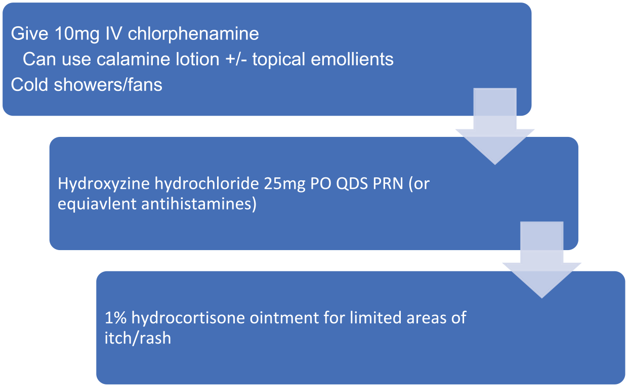 Management of skin toxicity (pruritus). IV = intravenous, PO = oral, QDS = four times daily, PRN = as needed.