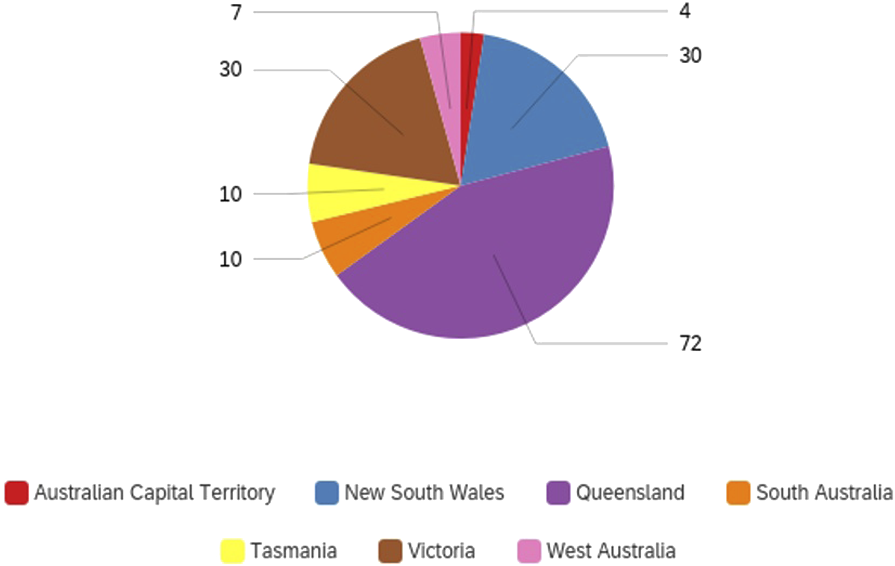 A total of 163 individuals from all states and territories except the Northern Territory completed the survey (Figure 1). Survey Participants by State/Territory