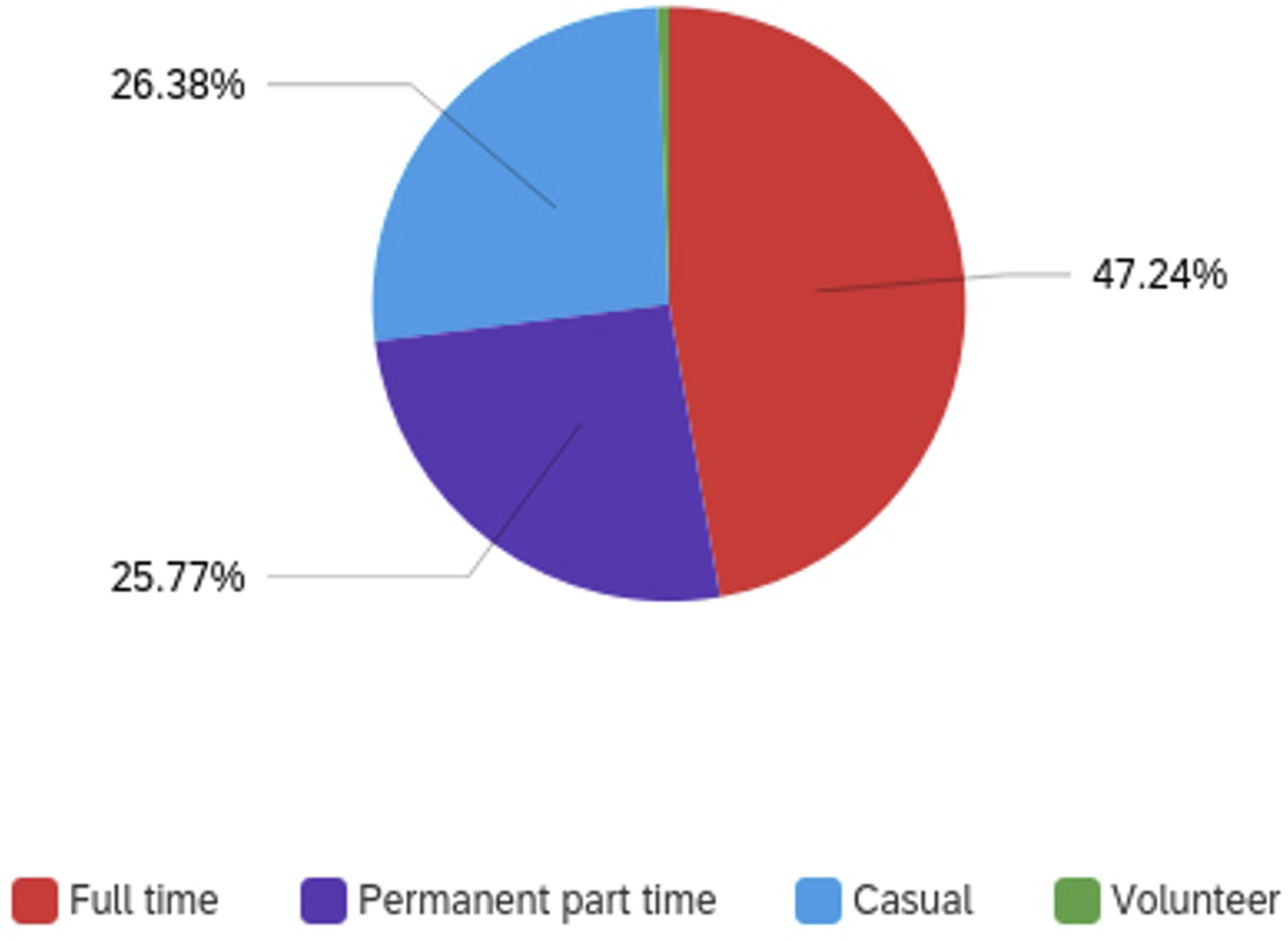 Participants worked in a range of roles, but most were in leadership roles with higher levels of responsibility for curriculum decisions such as coordinator (n = 71), educational leader (n = 19), assistant coordinator (n = 7) and regional manager (n = 13). There was a higher percentage of participants in permanent employment, consistent with the senior roles held by most participants. The majority were in full-time employment (n = 77), but large numbers also in part-time (n = 44) and casual roles (n = 43) (Figure 2). Participants’ Employment Conditions