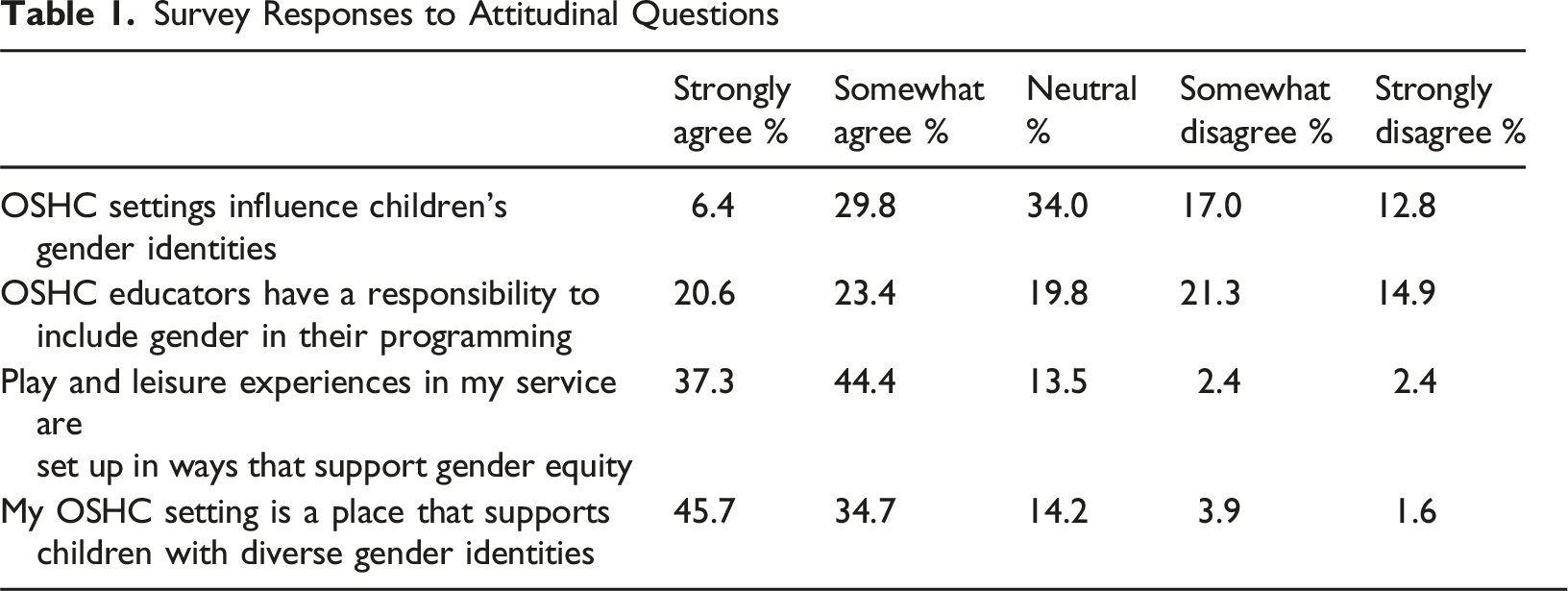 Attitudinal questions took the form of multiple choice questions using a Likert scale. Questions about curriculum and practice used both multiple choice and open-ended, written responses. It was hoped that the open-ended questions would provide insights into what was expected to be a wide range of curriculum approaches, reflective of a variety of attitudes to gender, qualifications and diverse settings. It was also hoped these responses would provide some knowledge on the sorts of barriers that can limit how educators attend to a sensitive issue like childhood and gender.