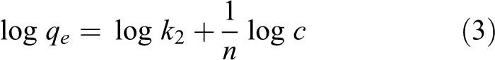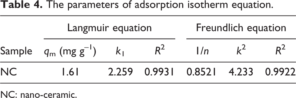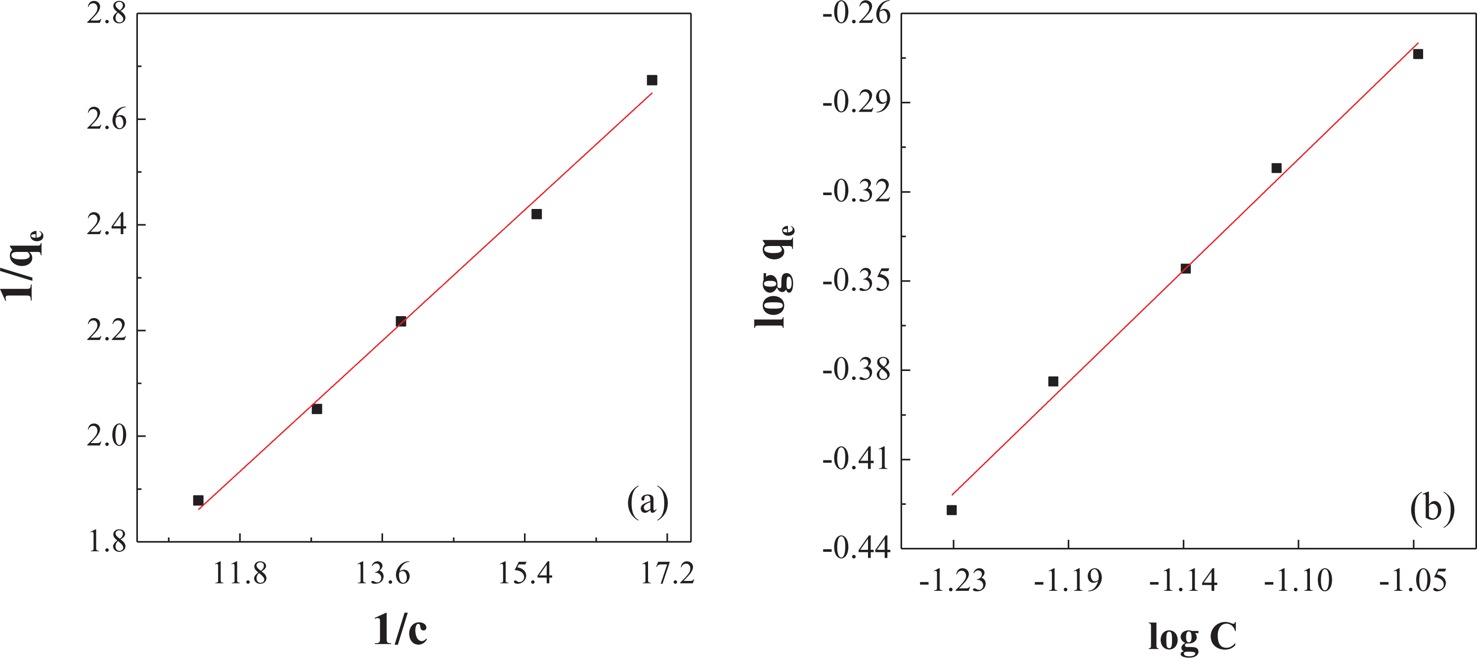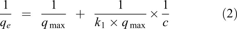 The isotherm can account for the relationship between the equilibrium concentration of the adsorbate and the equivalent of the adsorbate on the adsorbent. Common adsorption isotherm models mainly include Langmuir and Freundlich adsorption equation, and they are expressed as follows