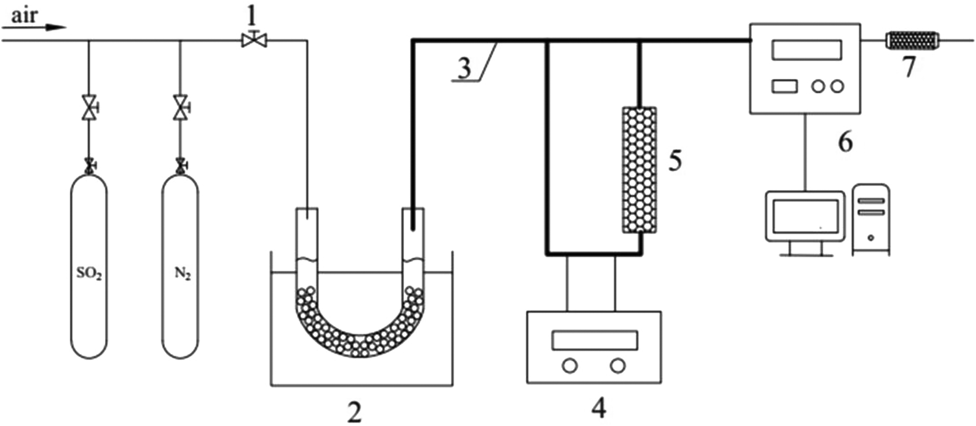 Schematic of the experimental setup. 1: valve; 2: mercury vapor generator; 3: heating band; 4: temperature control device of heating band; 5: adsorption bed reactor; 6: RA915+ mercury analyzer; 7: exhaust gas absorption device.