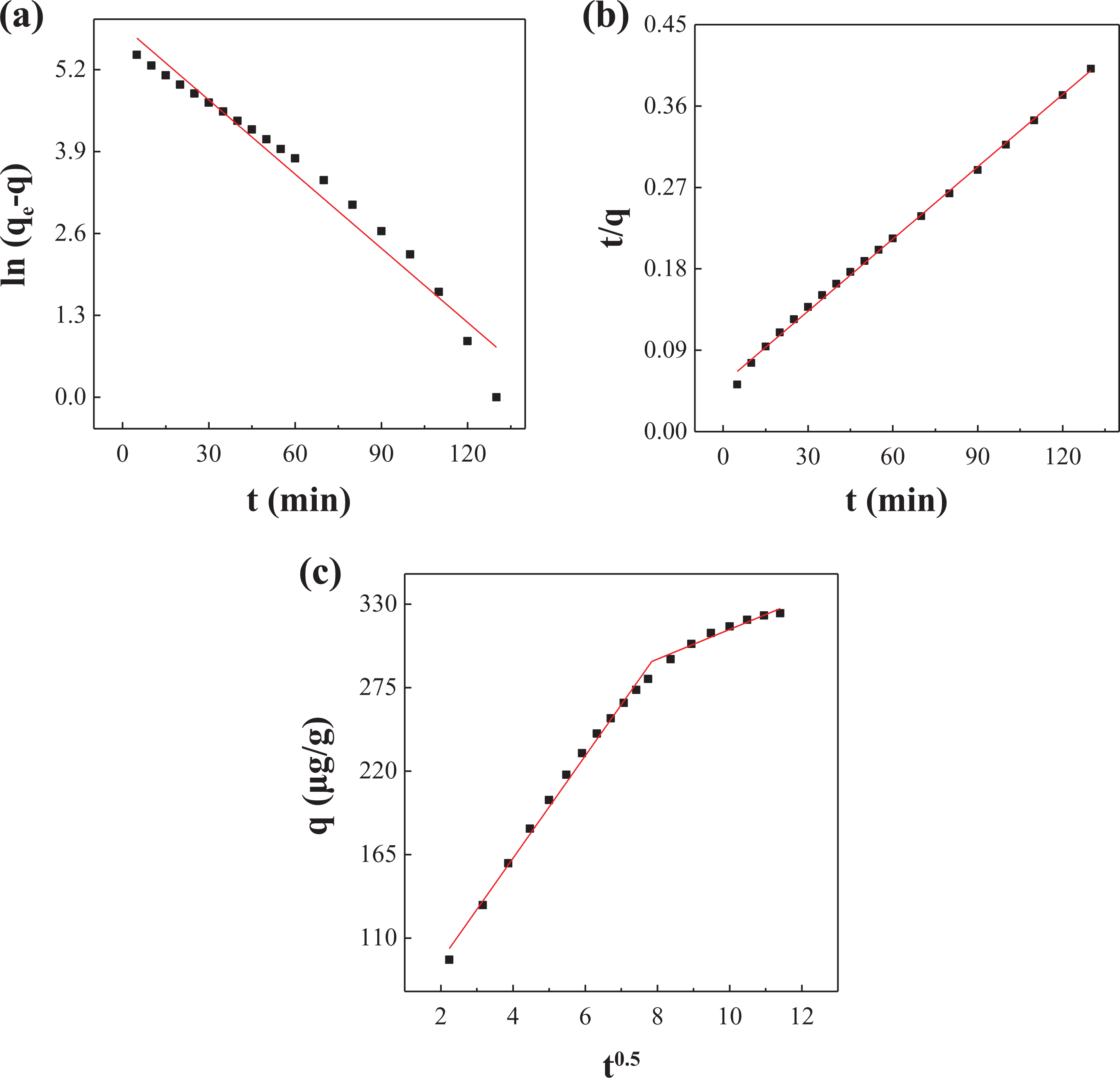 The fitting curves of (a) pseudo-first-order kinetics, (b) pseudo-second-order kinetics, and (c) intra-particle diffusion equation.