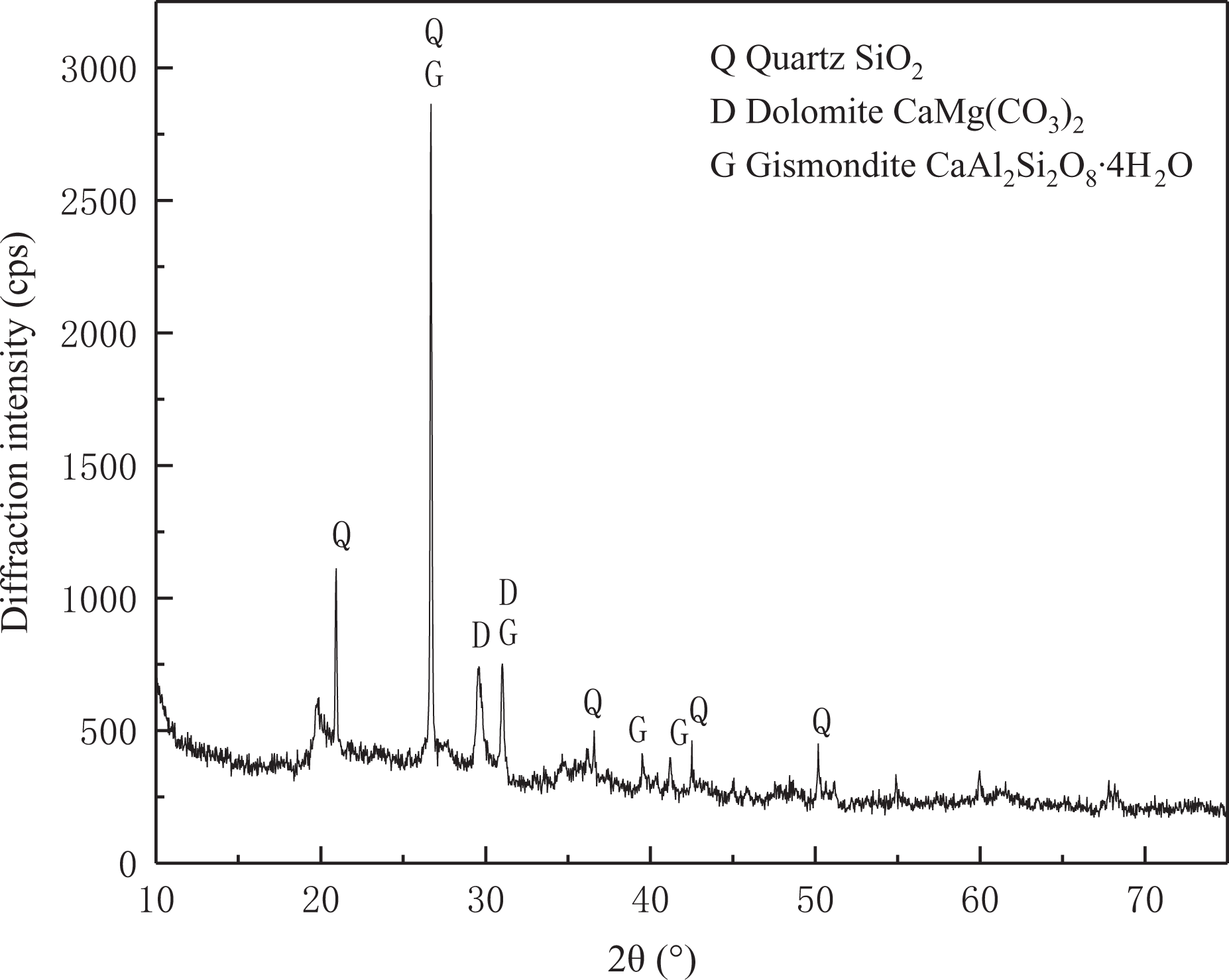 The material sample was khaki. After XRD test, the main components of NC were quartz, dolomite, and gismondite (Figure 3).