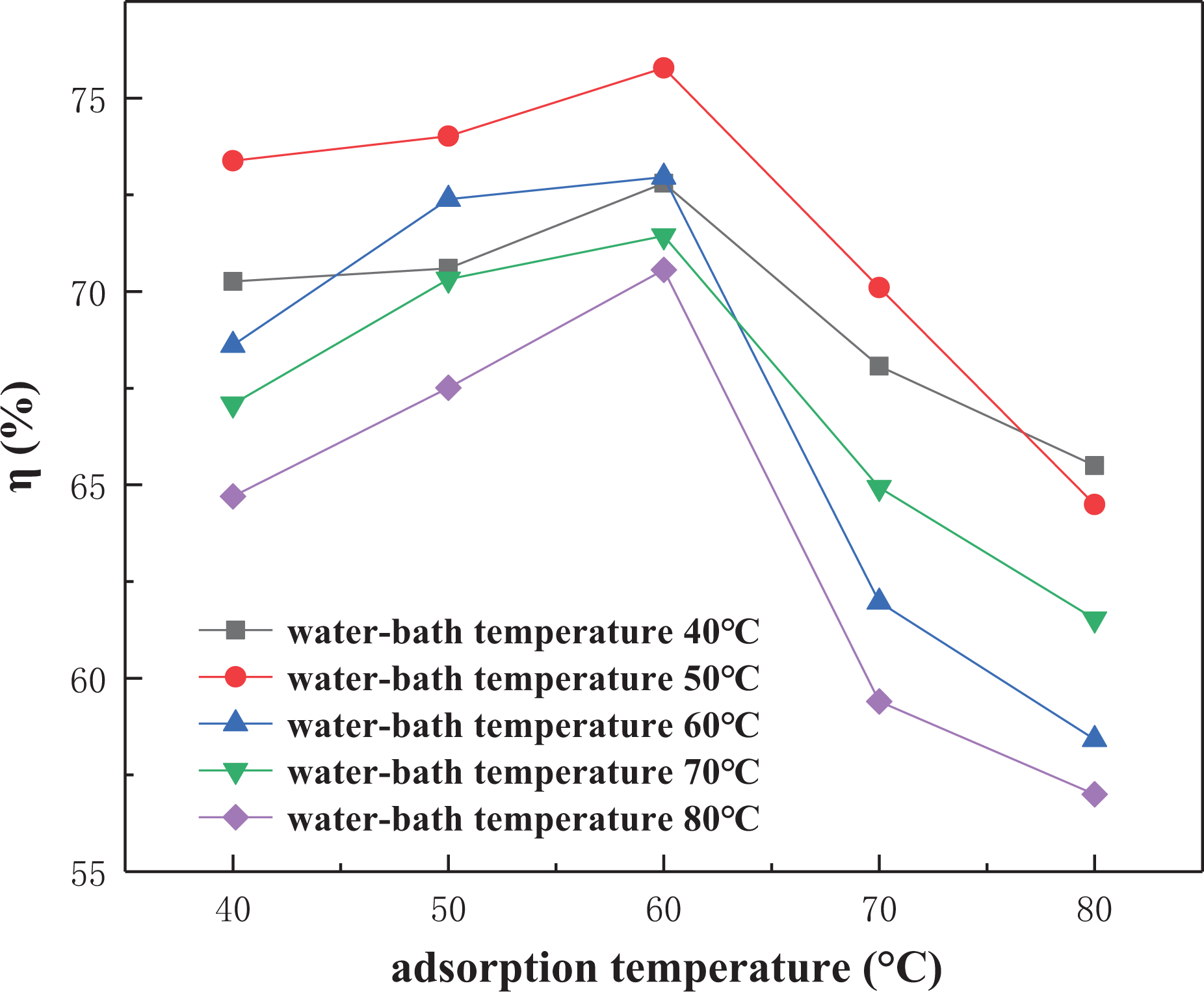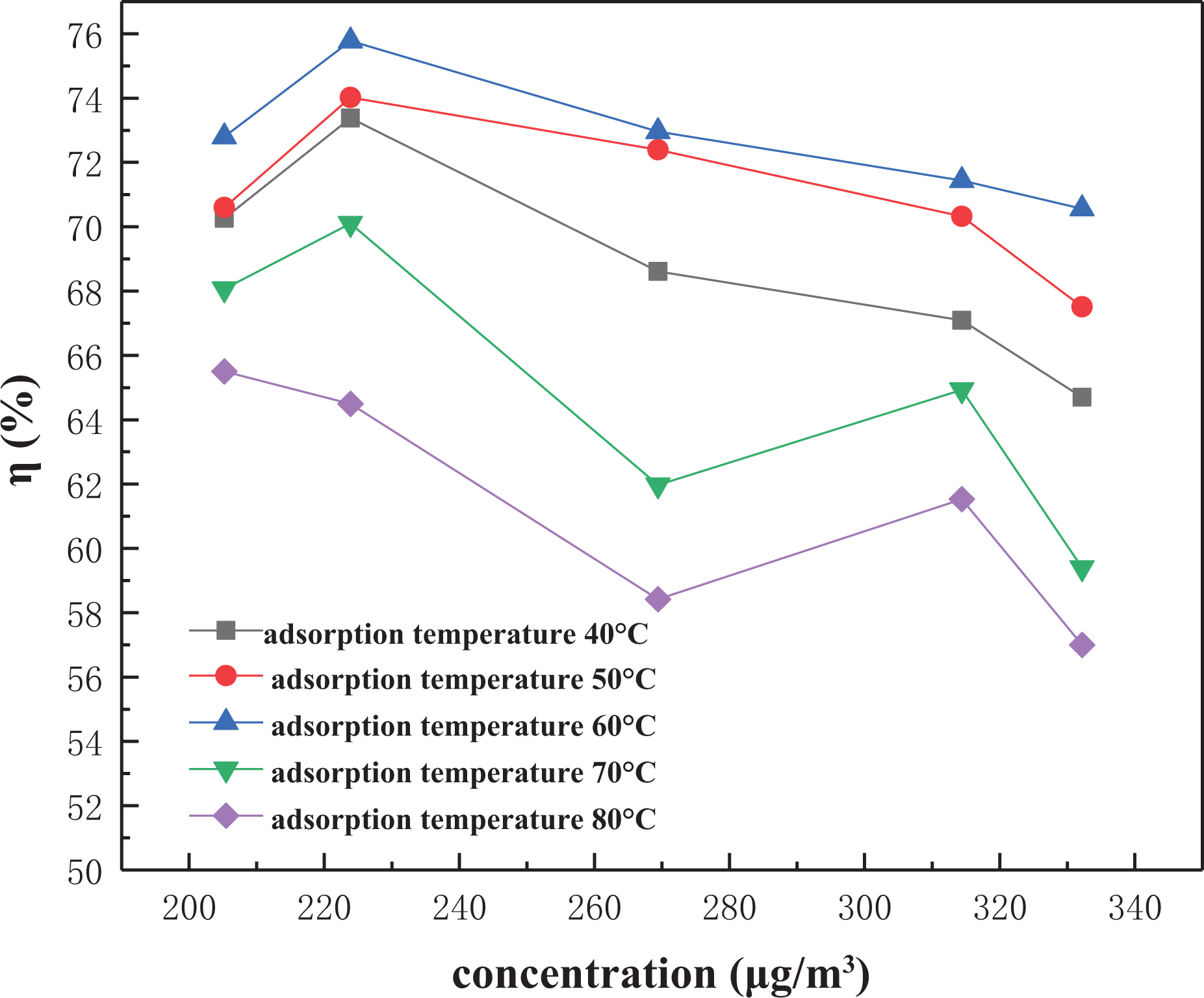 In the experiment, the effect of adsorption temperature on mercury removal efficiency was studied by changing the temperature of the heating band and changing the temperature of the region where the adsorbent was located. Due to the influence of the material properties of the tetrafluoroethylene tube, it could not be heated to a higher temperature. Therefore, the adsorption bed temperature selected in this experiment was 40–80°C, the airflow rate was 1.5 L min−1, and the mass of adsorbent was 2 g.