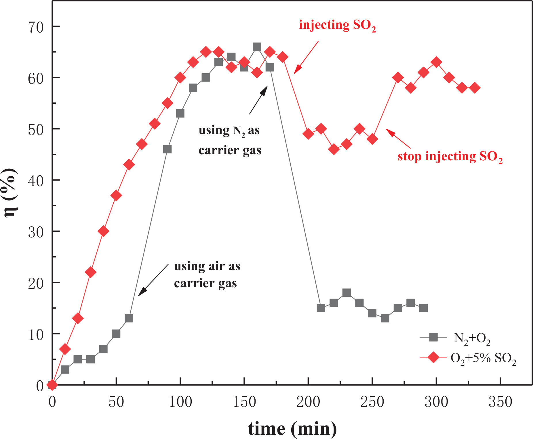 When using air and SO2 as carrier gas, it can be seen from Figure 9 that the mercury removal rate of the NC before the injection of SO2 is 64% on average, but