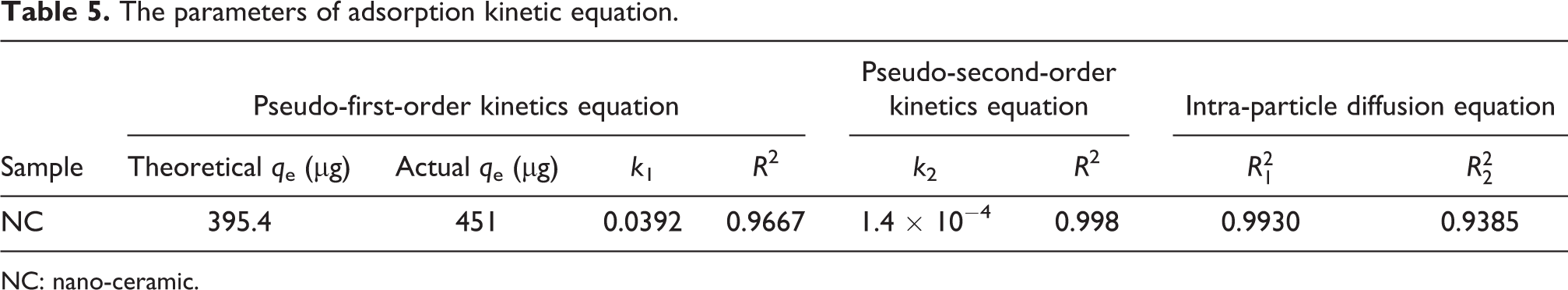 Kinetic analysis is a very important parameter to study the speed control steps in the adsorption process. Common adsorption kinetic models mainly include particle internal diffusion model, pseudo-first-order model, and pseudo-second-order model. The first two models which come from the mass balance equation are used to describe the internal diffusion and external mass transfer process. Pseudo-second-order model is mainly used to describe chemical adsorption process.