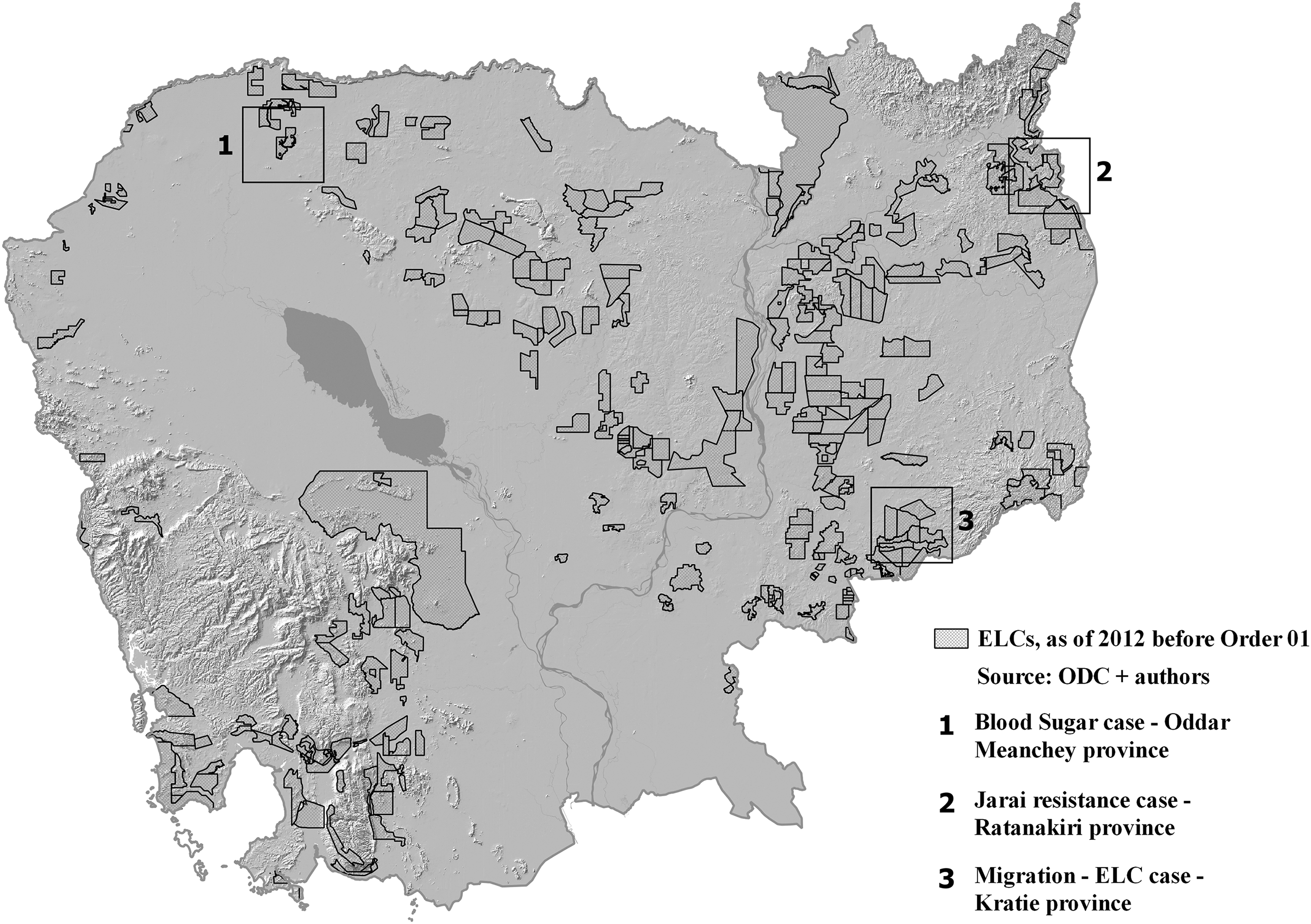 Building on a rich literature relating to land conflicts and State-making in Cambodia, we specify this theoretical point of departure in three ways. We first envisage land conflicts as dynamic processes. Research on land conflict resolution and subsequent State formation processes reveals that efforts to resolve disputes involve complex negotiations with various levels of State authorities having different power relations and practices that change over time (Young, 2016). In particular, we do not see the State as a static power. It changes tone, position, and tactics depending on pressures and opportunities. The literature refers to the notion of “political opportunity structure” (Tarrow, 1994), which suggests that the change in power structure opens windows of opportunities for rural movements to resist. In 2012, for instance, the government issued an order (known as Order 01) that established a moratorium on new Economic Land Concessions (ELCs). Order 01 also initiated a process of revision for ongoing ELC projects as well as a land titling campaign aiming to provide smallholder farmers with land tenure security when their land rights were disputed by ELCs. Analysts suggest that the measures were politically motivated as they aimed to calm the social unrest ignited by the development of ELCs just before important communal and national elections (Biddulph and Williams, 2017; Grimsditch and Schoenberger, 2015). But as Schoenberger (2017) also argues, Order 01 created a rupture in the pre-existing tenure arrangements by sending agents of the central State out into the frontiers. Recently, the government established a countrywide initiative based within the Ministry of Land Management, Urban Planning and Construction to address land conflicts (Sek, 2017). It also reorganised the National Authority for Land Dispute Resolution to investigate and resolve high-profile land disputes and oversee land dispute resolution by the Cadastral Commissions and relevant authorities (Pech, 2018).