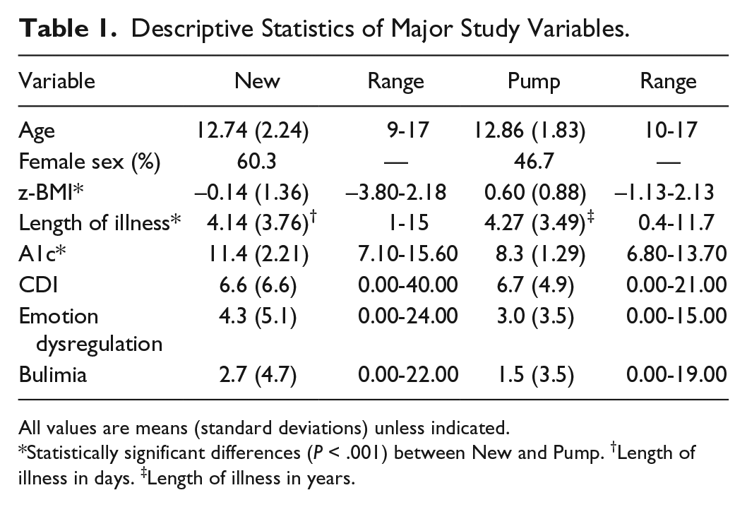 A1c, hemoglobin A1c; CBT, cognitive behavioral therapy; CDC, Centers for Disease Control and Prevention; CDI, Children’s Depression Inventory; CSII, continuous subcutaneous insulin infusion; DCCT, Diabetes Control and Complications Trial; DEB, disordered eating behavior; EDI-III, Eating Disorder Inventory–III; GRU, Georgia Health Sciences University; MDI, multiple daily injections; New, newly diagnosed; Pump, transitioning to pump regimen; T1D, type 1 diabetes; z-BMI, body mass index z-score.