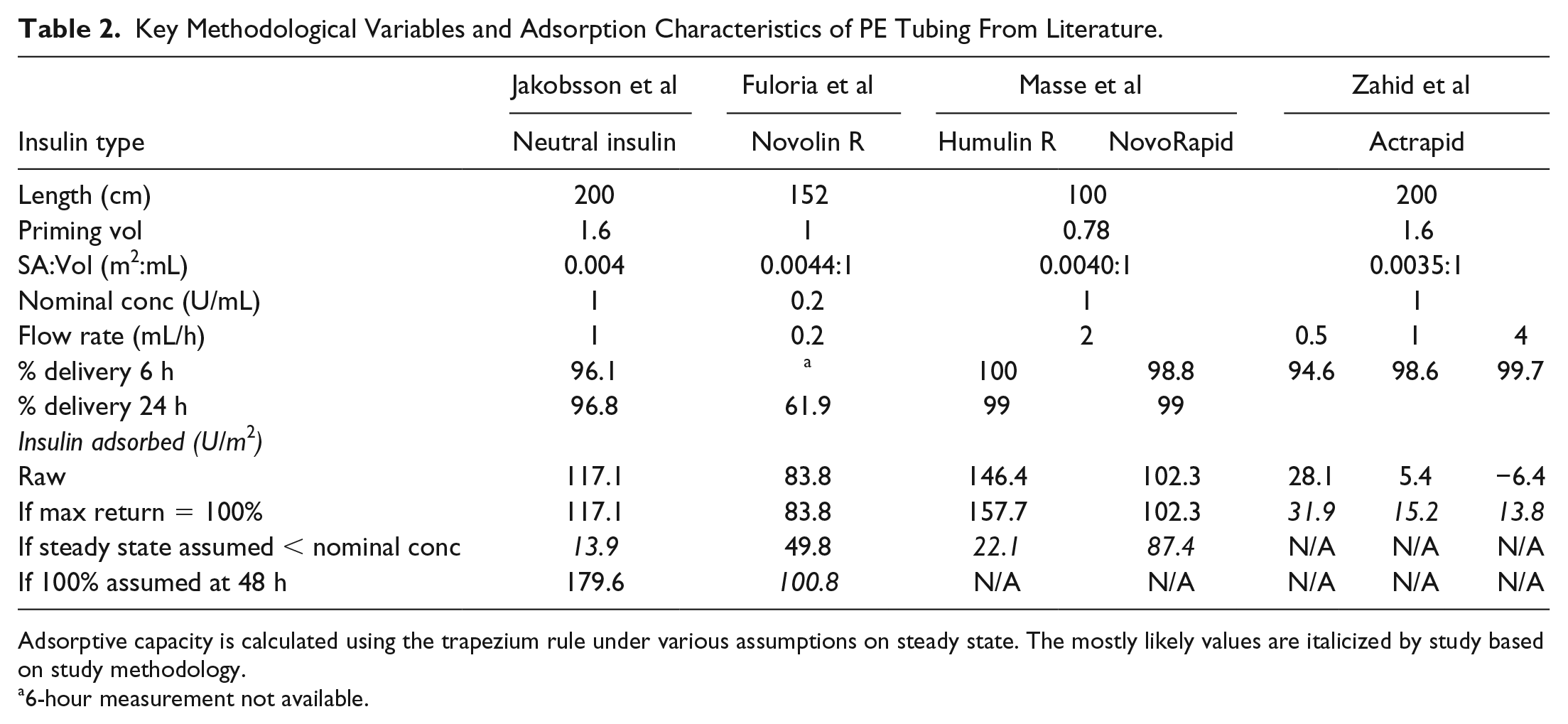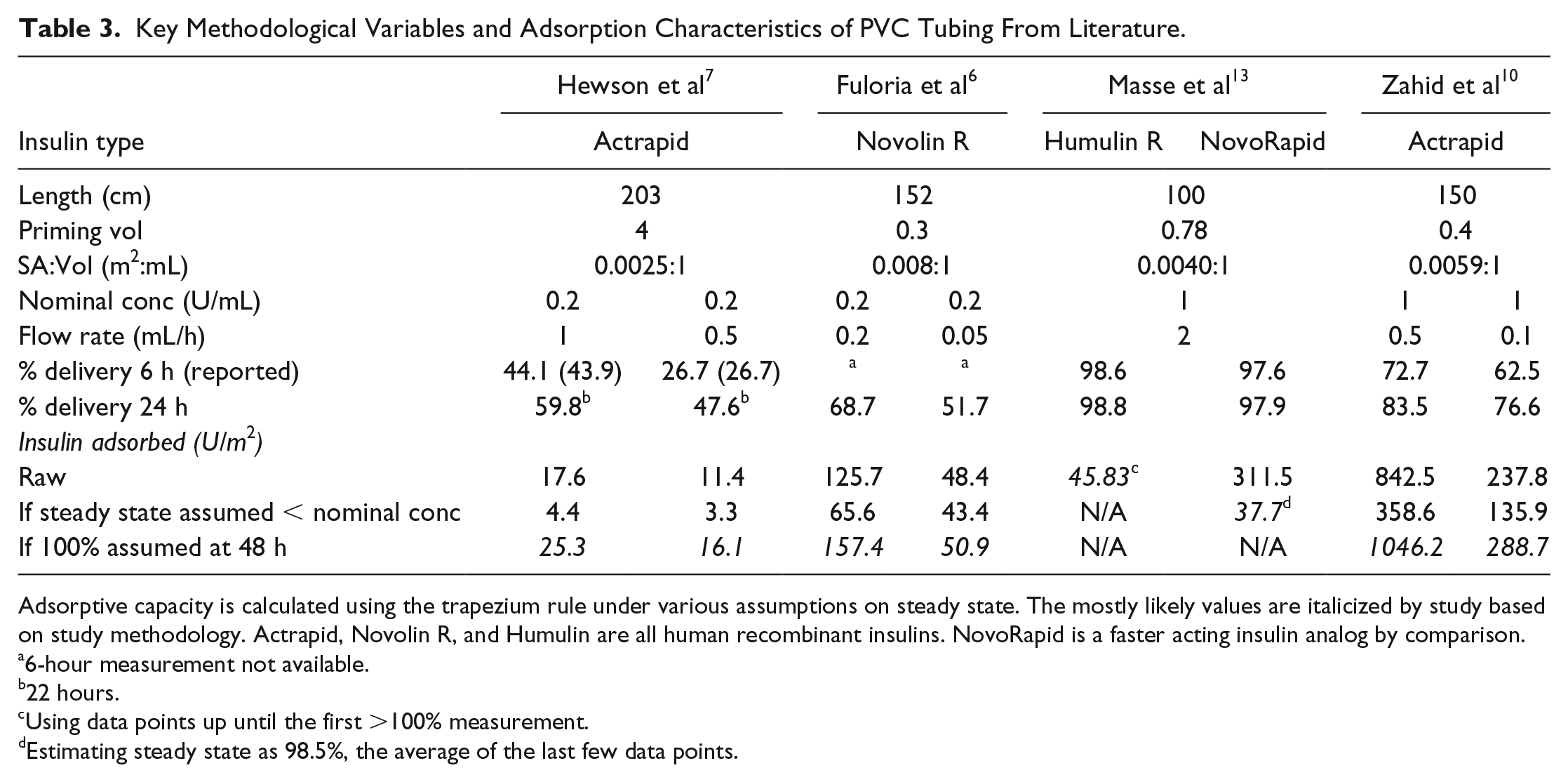 Adsorptive capacity is calculated using the trapezium rule under various assumptions on steady state. The mostly likely values are italicized by study based on study methodology. Actrapid, Novolin R, and Humulin are all human recombinant insulins. NovoRapid is a faster acting insulin analog by comparison.