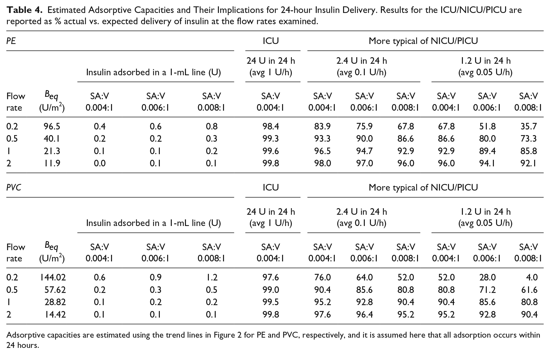In low flow and low dose situations, the fraction of 24-hour insulin delivery can range between 50% and 80%, depending on the line used and the total 24-hour dosage. Thus, insulin therapy in NICU and PICUs is likely more directly affected by this issue.6,7 However, higher insulin infusion has been noted in the adult ICU when infusion sets are changed, 8 or between PE and polyurethane lines, 36 indicating a noticeable effect.