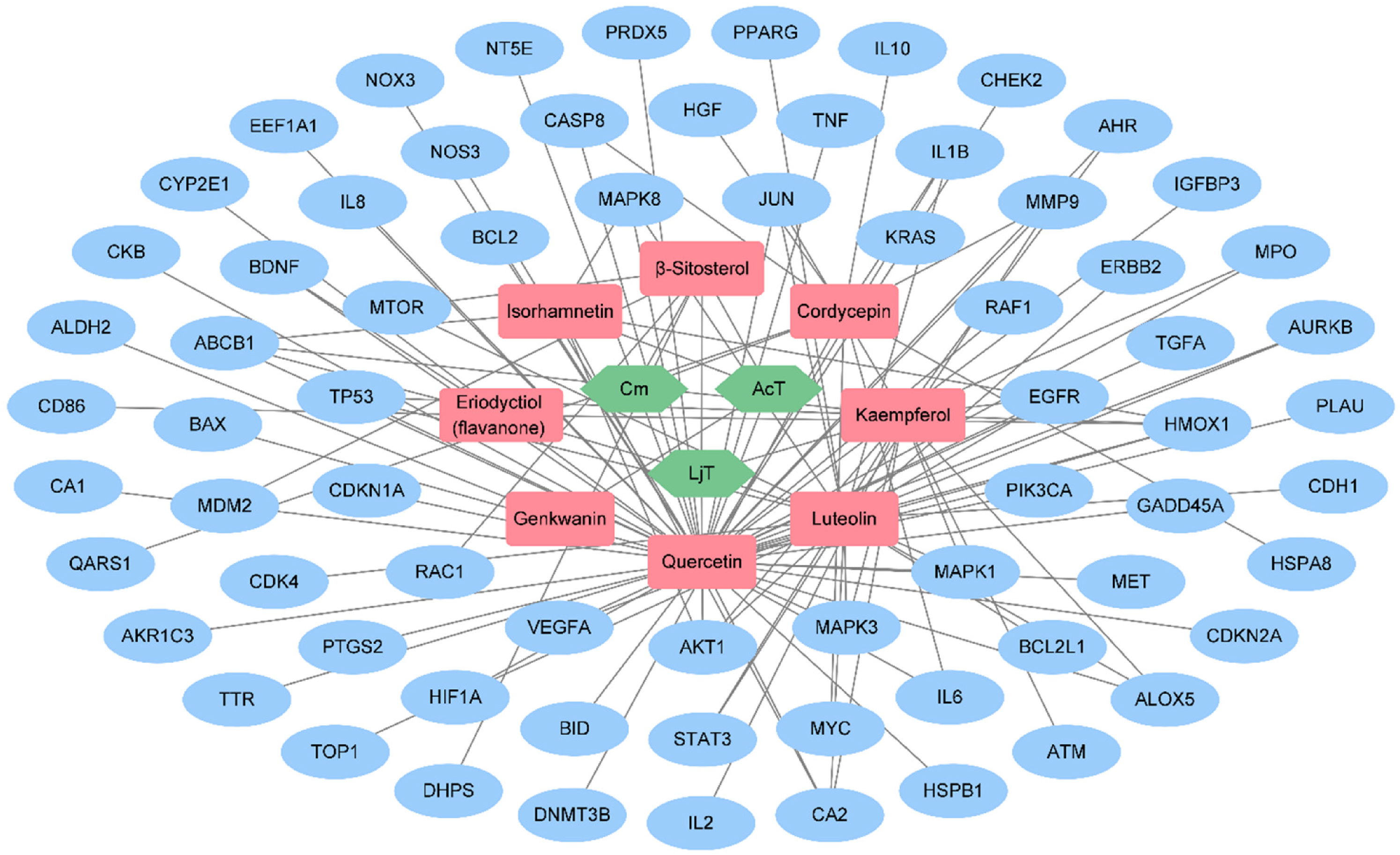 The herbal medicine-active phytochemical compound-target (H-C-T) network of FDY003. Green hexagons, herbal medicines; red round rectangles, active phytochemical compound; blue ellipses, gastric cancer (GC)-associated targets.