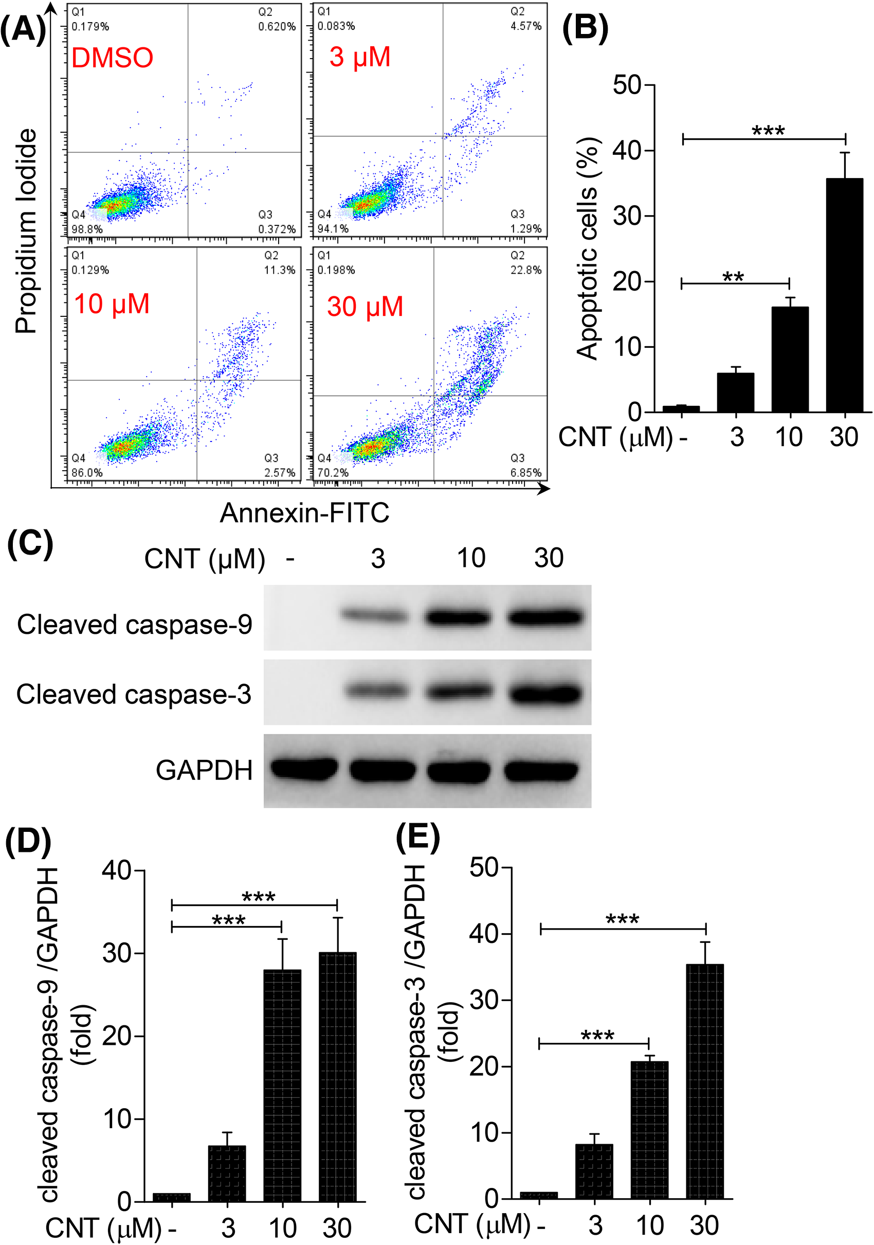 To confirm the effect of convallatoxin on K562 cell apoptosis, we used Western blotting to detect the expression of apoptosis-related proteins, such as cleaved caspase-3 and cleaved caspase-9 (Figure 3C to E). The results showed that after treatment with 10 and 30 μM of convallatoxin, pro-apoptotic protein cleaved caspase-3 was upregulated by 28% and 30% in K562 cells, respectively, while cleaved caspase-9 was upregulated by 20% and 35%, respectively. These results suggest that convallatoxin promotes the apoptosis of K562 cells in a dose-dependent manner (Figure 4).