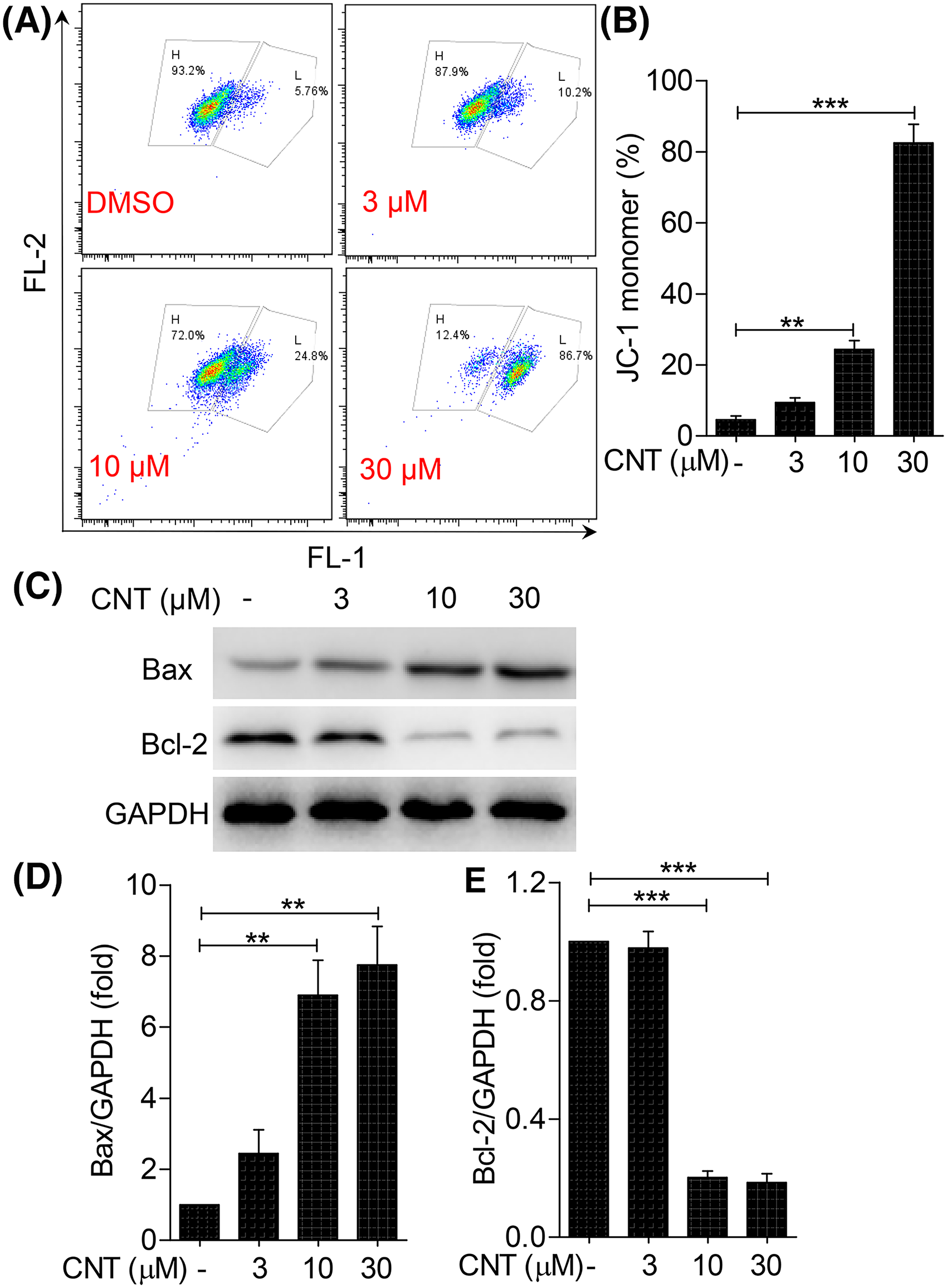 Convallatoxin induces cell apoptosis through the mitochondrial pathway in K562 cells. (A) JC-1 fluorescent probe was used to detect MMP changes in K562 cells. (B) Percentages of JC-1 monomer were calculated. (C) After stimulation with different concentrations of convallatoxin for 24 h, Western blot was used to detect the expression of apoptosis-related proteins Bax and Bcl-2. (D-E) Gray value analysis was performed for each band. *