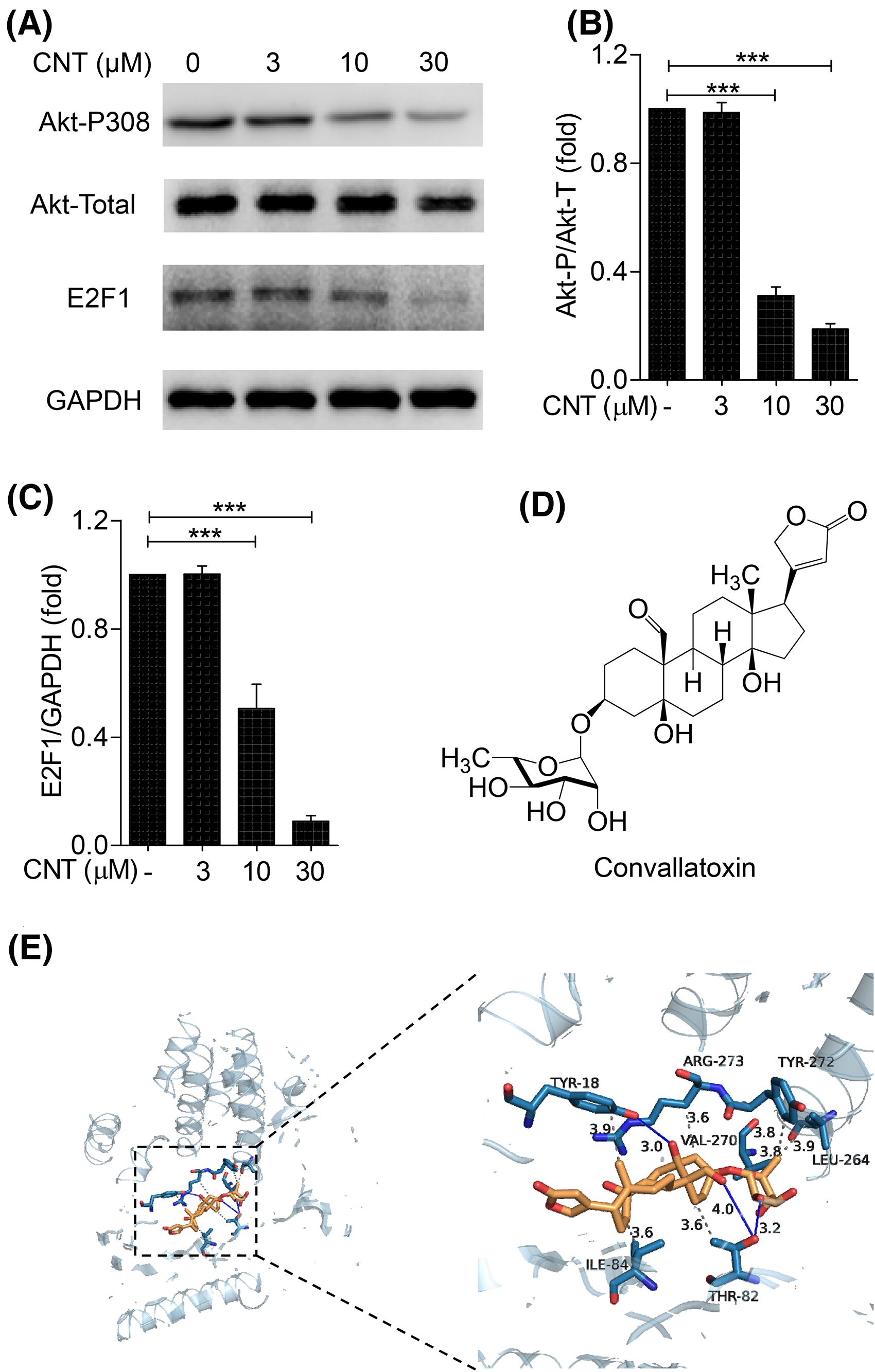 To confirm further the interaction between convallatoxin and Akt1, we performed a molecular docking assay using the molecular structure of convallatoxin (Figure 5D) and the crystal structure of Akt1, which contains a critical structural motif for the interactions. The results showed that convallatoxin is directly bound to Akt1 (Figure 5E) with a binding energy of −10.4 kcal/mol, suggesting that convallatoxin has a strong affinity with the target protein Akt1. The docked convallatoxin showed extensive interactions with Akt1, including those with the Tyr18, Thr82, Ile84, Leu264, Val270, and Tyr272 residues, and Agr273 side chain with 3.9, 3.6, 3.6, 3.9, 3.8, 3.8, and 3.6 Å hydrophobic bonds, respectively. In addition, convallatoxin interacted with Tyr18 through 3.0 Å hydrogen bonds and with the Thr82 residue through 3.2 Å and 4.0Å hydrogen bonds. Thus, our data demonstrate that convallatoxin directly targets the Akt-E2F1 signaling pathway by binding with Akt1.