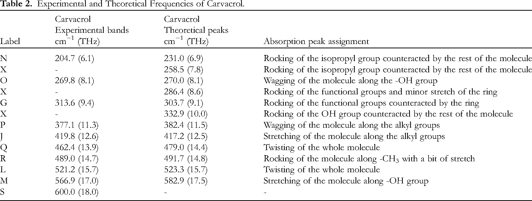The assignment was based on the vibration modes, together with approximate assignment by the vibrational frequency. From the assignment, it was discovered that thymol and carvacrol share four absorption bands. These bands denoted