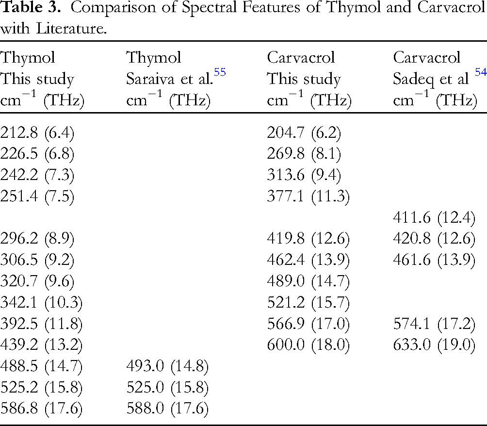 A further comparison was made between this work and the literature as shown in Table 3. There was correspondence between some of the observed absorption bands and the related literature studies.54,55 The most outstanding observation is that the literature is dominated by mid-infrared studies. This has left the lower frequency range unexplored for these materials. It was found imperative to perform the low-frequency studies because the availability of an extended spectral database of these materials is crucial for a better understanding of their properties. This information will be valuable in the manufacture and identification of products derived from medicinal plants or essential oils in particular.