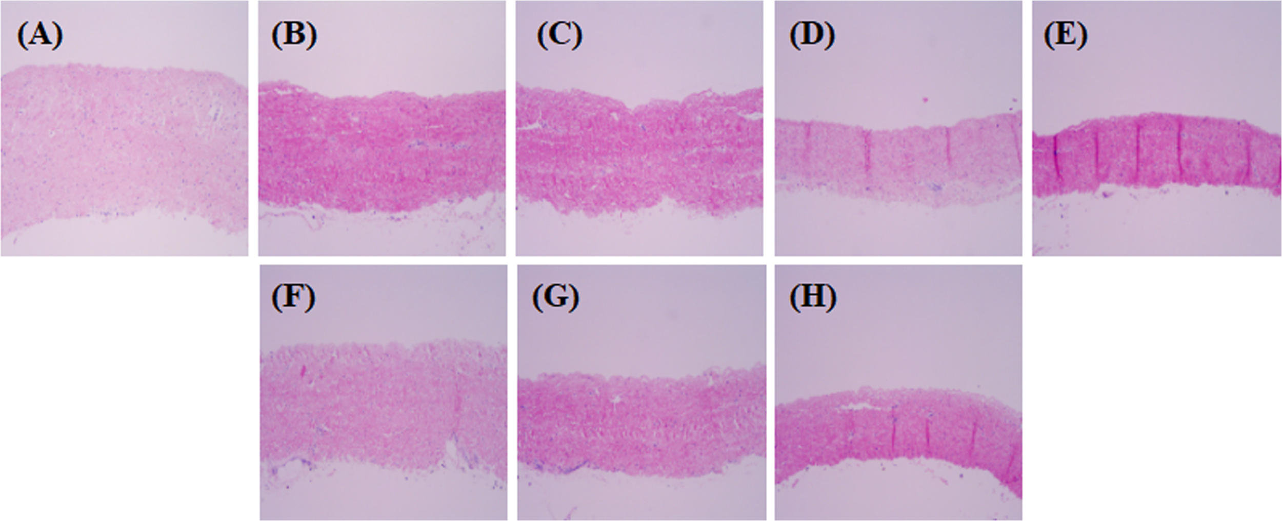 Porcine pericardial tissues were processed according to our developed decellularization protocol using 0.25% SDS + Triton X-100 and subjected to a multistep method using hypotonic, isotonic, and hypertonic buffer solutions (Supplementary Fig. S1) (Supplementary Fig. S2). Separate samples were prepared for each enzyme treatment, which was treated with or without 0–2000 unit/mL PNGase-F, respectively, in the absence and presence of α-galactosidase (0.1–0.2 unit/mL) for 24 h. H&E staining was used to examine the fiber structure, such as the collagen fiber pattern, structural loosening, and the presence of cells, and in all cases, a normal collagen structure similar to that of fresh tissue was observed regardless of enzyme concentration (Fig. 1) (Supplementary Fig. S3).