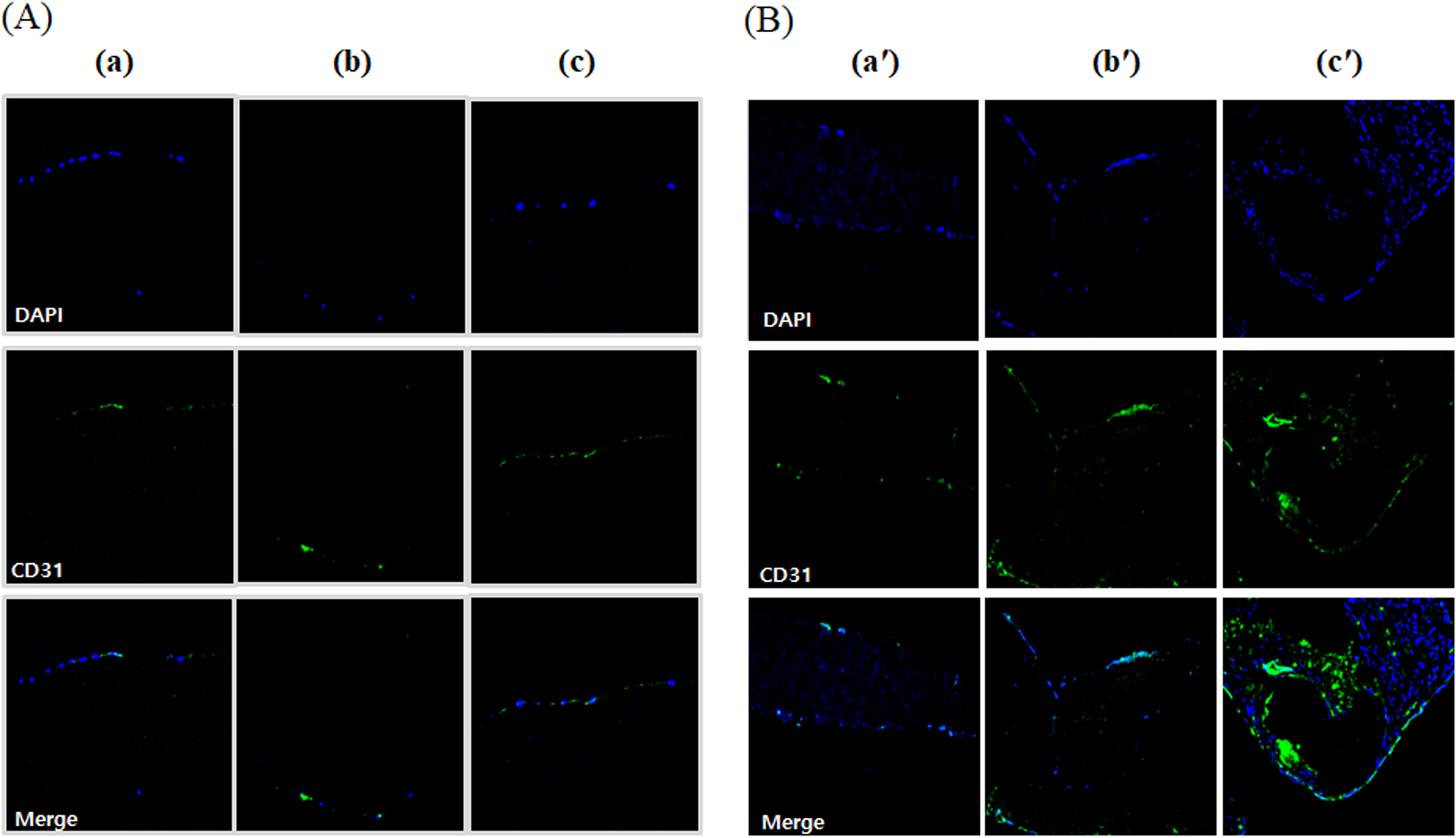 Immunofluorescence staining in both ADSCs and HUVECs seeded onto modified pericardium