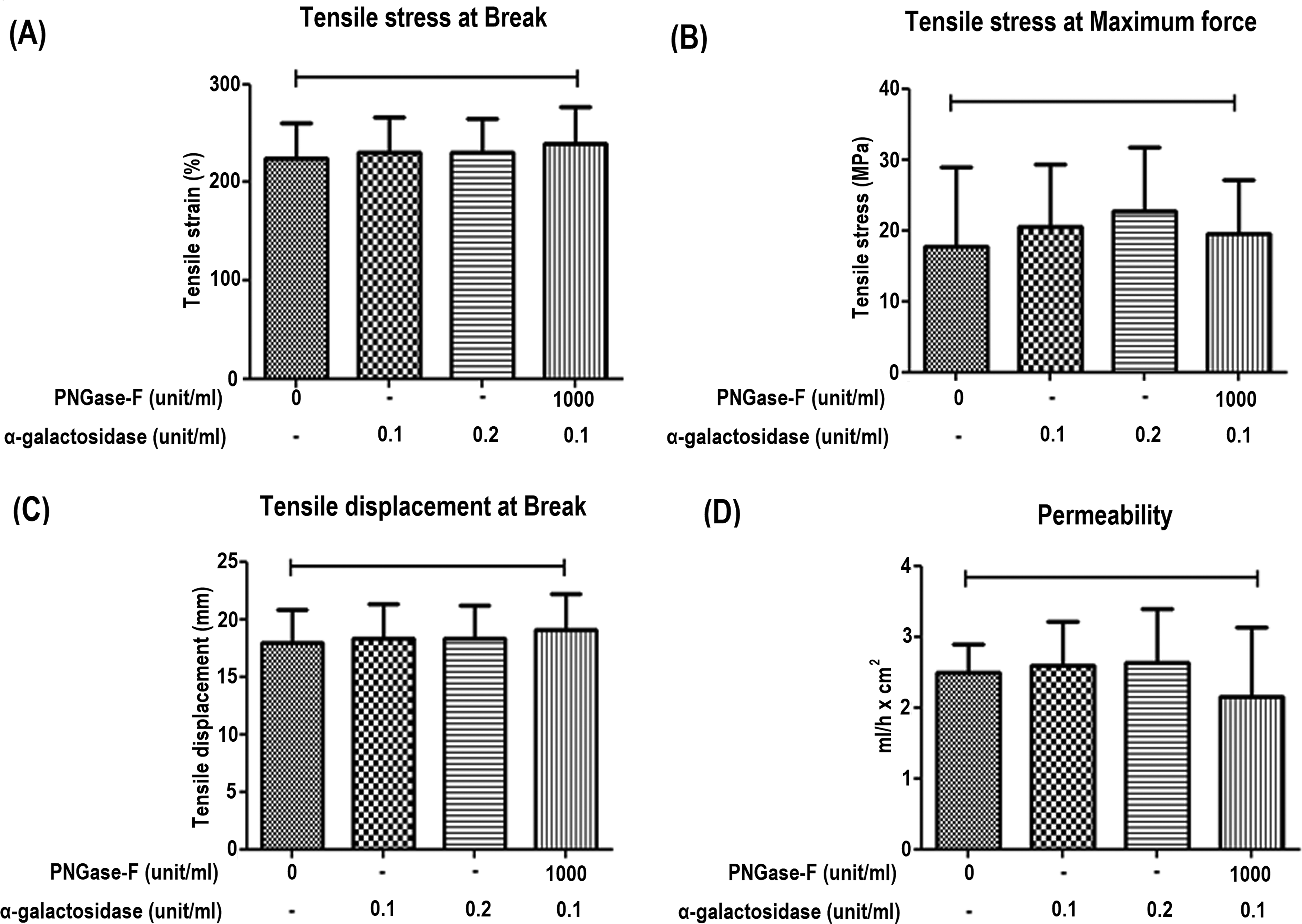 Biomechanical properties were determined with a uniaxial tensile test and a permeability test. The tensile stress and permeability test showed no significant differences between native porcine tissue and the differently (0–1000 unit/mL) PNGase-F-treated porcine tissue and differently (0.1–0.2 unit/mL) α-galactosidase-treated porcine tissue and PNGase-F and α-galactosidase both treated porcine tissue (Fig. 2). These findings suggested that the effects of PNGase-F/α-galactosidase treatment concentration and combination were not reflected in the biomechanical properties of the porcine pericardium.
