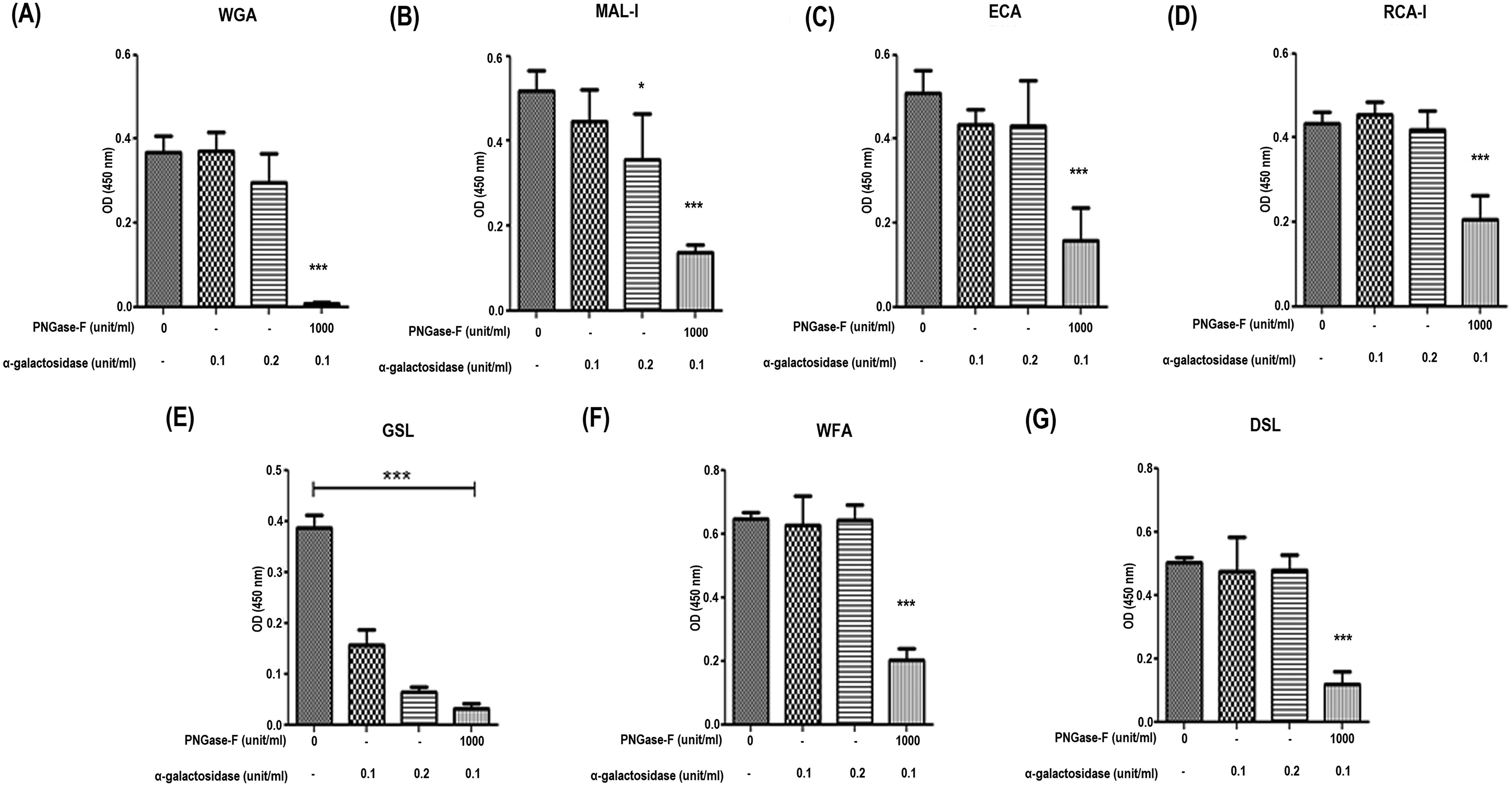 To quantitatively determine the expression of MAL-I, WGA, RCA-I, GSL, ECA, PNA, SBA, WFA, and DSL, a lectin binding assay for native, PNGase-F (0–1000 unit/mL), and α-galactosidase (0.1–0.2 unit/mL), α-galactosidase 0.1 + PNGase-F 1000 was performed. PNGase-F treatment significantly inhibited lectin binding levels in a concentration-dependent manner. Interestingly, when α-galactosidase was treated simultaneously with PNGase-F at the same concentration, most lectins showed reduced binding more synergistically compared to PNGase-F treatment alone (Fig. 4).