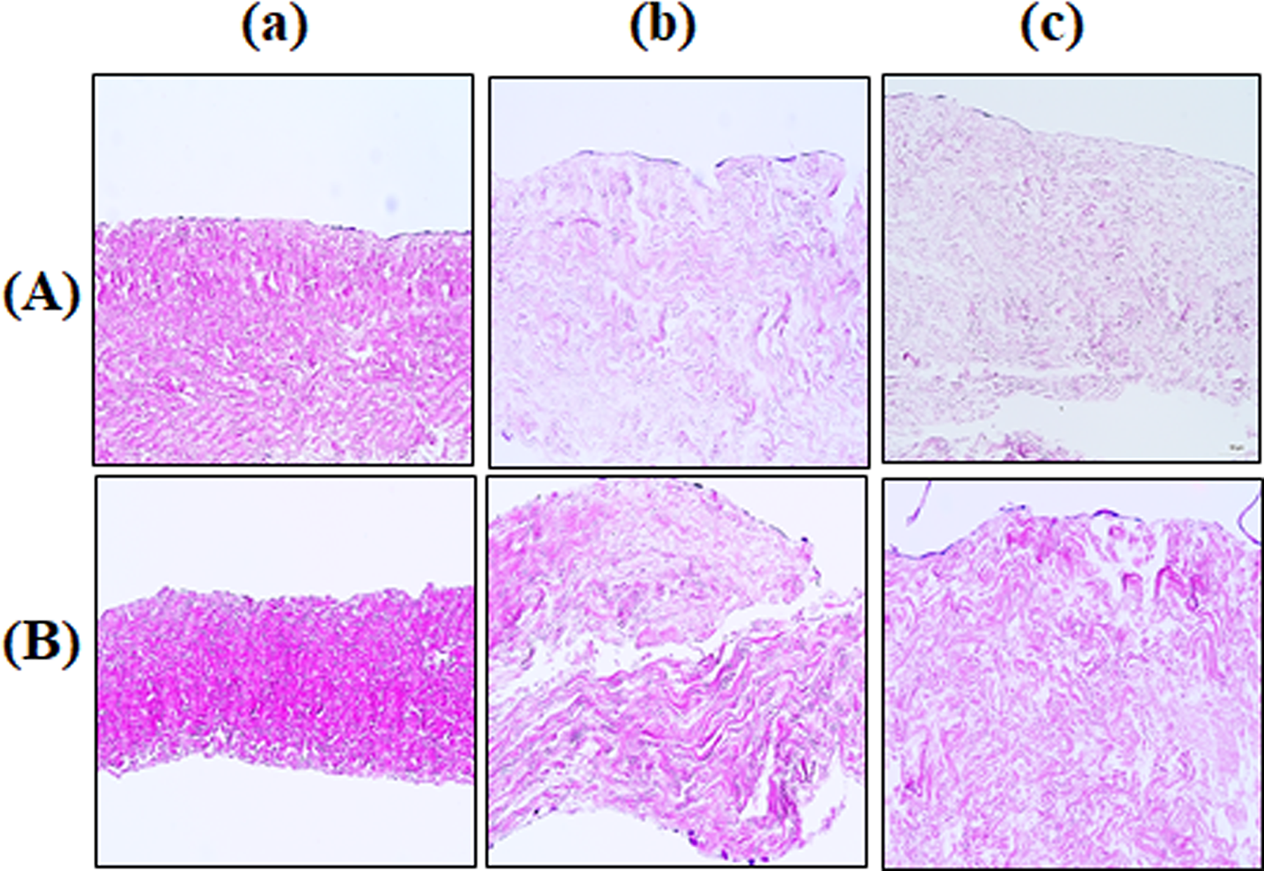 For histological staining, native and SDS + Tx-decellularized porcine pericardia were treated with different enzymatic treatments: α-galactosidase, PNGase-F, or α-galactosidase in combination with PNGase-F, and these sliced samples were fixed at 4% paraformaldehyde for 24 h in 4°C. Histological sections (5 μm) of each sample were stained for hematoxylin and eosin (H&E) and lectins staining. The tissue sections were incubated with lectins at 1:250 overnight at 4°C. Effects of the enzymatic treatments on carbohydrate-binding lectins such as isolectin B4 (IL-B4/GSL-IB4) (#B-1205, Vector Laboratories Inc), specific for α-galactose residues; Wheat Germ Agglutinin (WGA) (#RL-1022, Vector Laboratories Inc); Datura Stramoniumlectin (DSL) (#B-1185, Vector Laboratories Inc); Ricinus Communis Agglutinin I (RCA-I) (#RL-1082, Vector Laboratories Inc); Soybean Agglutinin (SBA) (#B-1015, Vector Laboratories Inc); Wisteria Floribunda Lectin (WFA) (#B-1355, Vector Laboratories Inc); Peanut Agglutinin (PNA) (#B-1075, Vector Laboratories Inc); Maackia Amurensis lectin I (MAL I) (#B-1315, Vector Laboratories Inc); Jacalin (#B-1155, Vector Laboratories Inc); Erythrina Cristagalli Lectin (ECA) (#B-1145, Vector Laboratories Inc). Stained sections were additionally stained with avidin-linked Texas Red (#A-2006; Vector Laboratories Inc). The sections were washed 3 times with PBS, and stained sections were imaged using an inverted fluorescence microscope (DMI4000B, Leica, Germany). Stained images were obtained using Application Suite X Image Viewer (Leica).