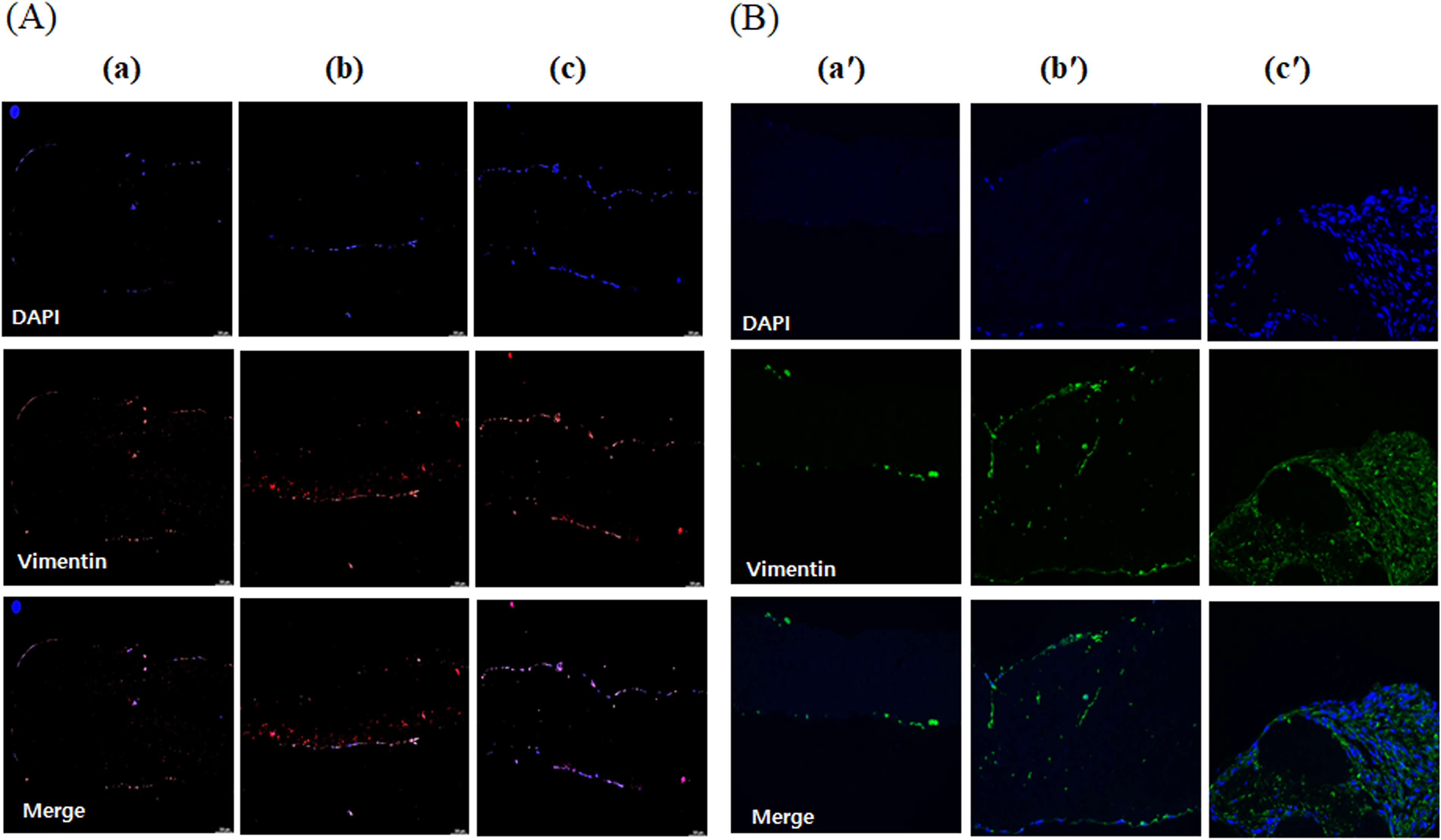 Through vimentin staining, we confirmed that MSCs migrated into the tissue, and the activation of interstitial cells was initiated, indicating the beginning of tissue remodeling. Particularly, as myofibroblasts can also exhibit vimentin positivity, this suggests that it represents an early stage of ECM remodeling and tissue repair. However, to confirm whether these cells are in the early stages of myofibroblasts, it is necessary to check for coexpression of α-SMA positivity.