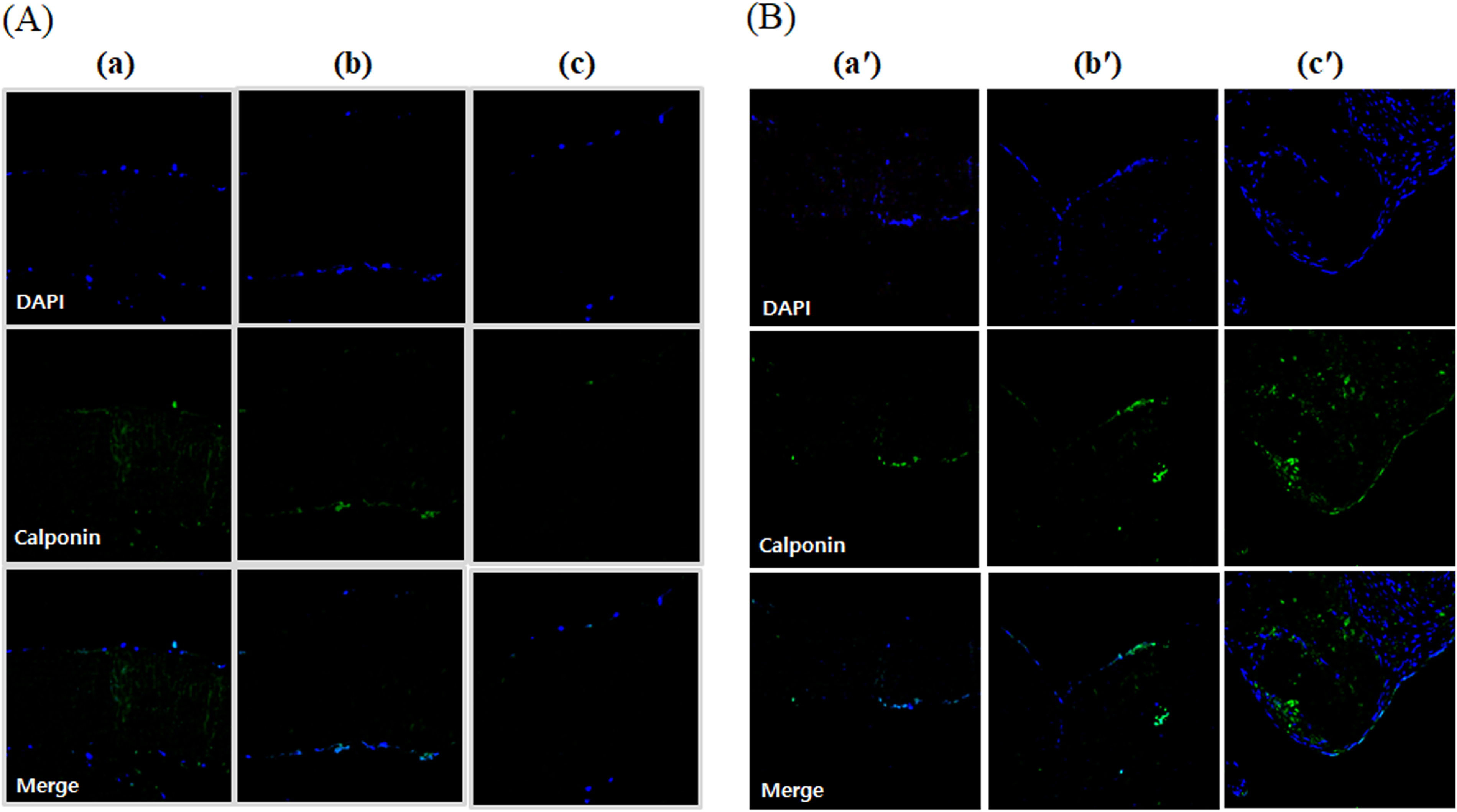 Calponin staining suggested that MSCs interacted with the surrounding ECM and transitioned into myofibroblasts, exhibiting a mature smooth muscle cell phenotype. This was particularly evident after 4 weeks of coculturing MSCs and HUVECs on tissue treated with α-galactosidase and PNGase-F, where calponin expression was significantly increased. These findings indicate that multipotential stem cells undergo recellularization at the valve site and differentiate into mature cell phenotypes.