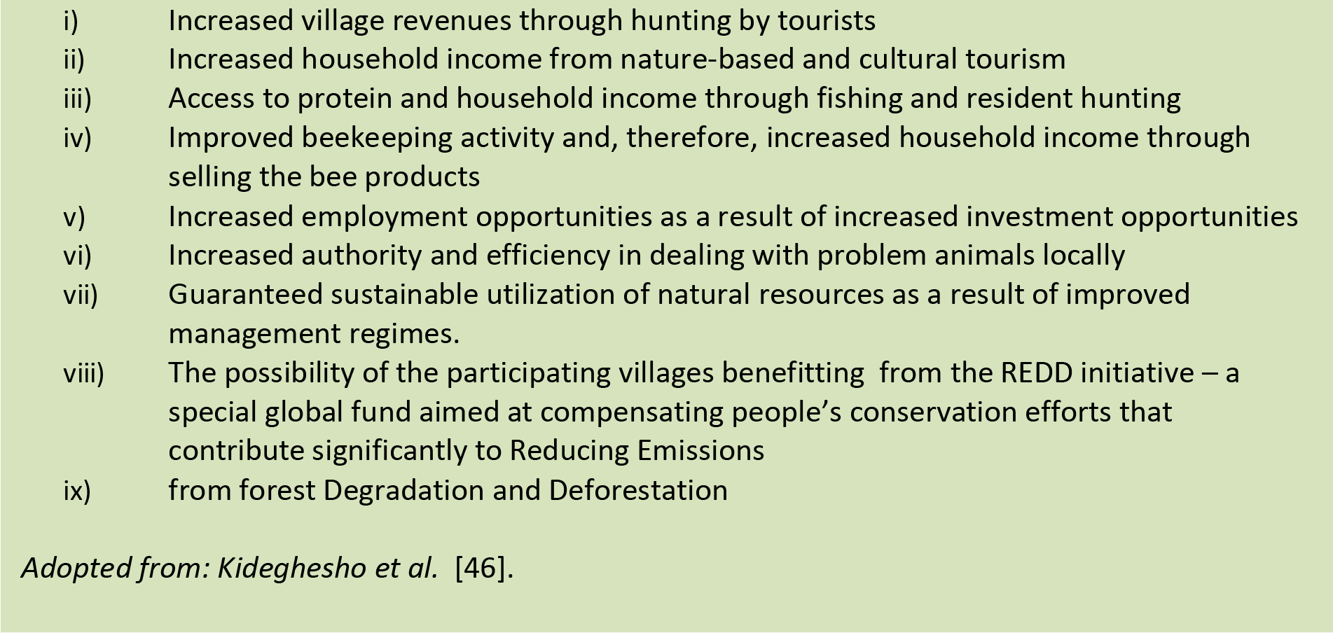 Creation of new wildlife protected areas, annexing critical areas to the already existing protected areas, and/or upgrading the existing protected areas to higher categories could be among the important measures. To make these measures effective, however, observance of human interests is imperative. Experience has shown that such measures often engender conflict by interfering with local livelihoods [1, 2, 17, 37, 44, 45]. A recent plan to establish Wildlife Management Areas (WMAs) in the buffer zones surrounding Serengeti National Park is a good stride. Numerous advantages can be envisaged from WMA initiative (e.g., Box 2). However, the measure may exacerbate economic and social costs to local communities. More effective and larger conservation areas, increased wildlife populations, and their proximity to human assets would mean increased crop damage, livestock depredation, and reduced human safety. The suitable policies to minimize the likely costs should, therefore, be formulated along with this strategy. For example, the government and its conservation agencies can adopt the problem-animal control program and develop effective mechanisms to compensate the victims for wildlife-induced damages.