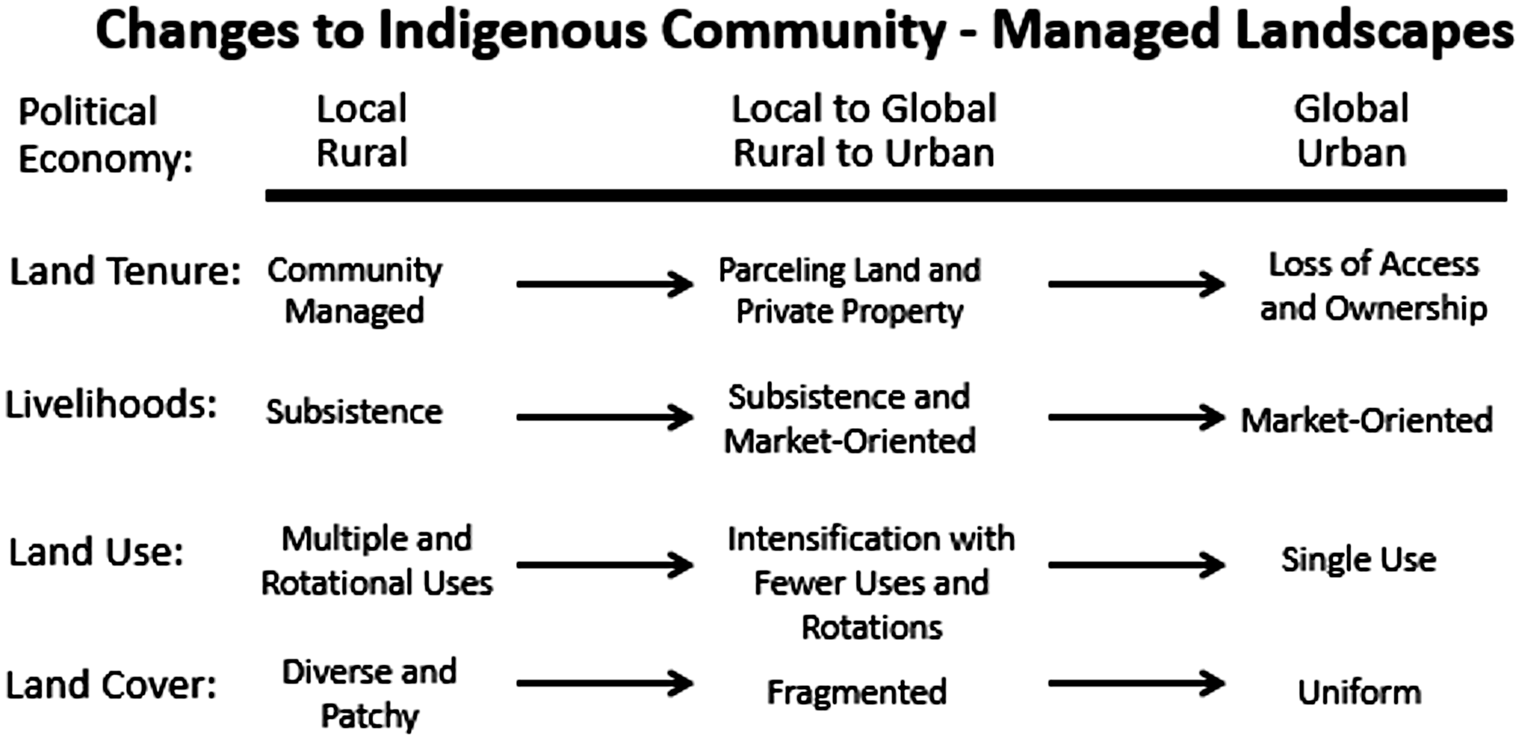 Overall, the changes to indigenous lands can produce broader scale landscape fragmentation and homogenization. Such changes can ultimately impact, and extensively alter, global biodiversity patterns, as landscape heterogeneity is often critical to broader biodiversity patterns (Vallejo-Ramos et al., 2016). Thus, beginning at a global level, as shown in Figure 1, we can trace a global-to-local pathway through the combined changes in traditional livelihoods and land use accompanying shifting land tenure, illustrating a top-down sequence that impacts a much broader landscape (Ogden et al., 2013). Exemplified in Figure 2 is the process of change, away from indigenous community-managed landscapes as a local rural political economy transitions to a global urban political economy.