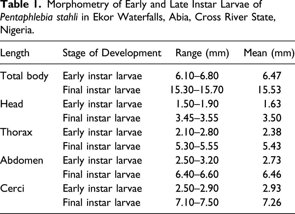 Morphometry of Early and Late Instar Larvae of Pentaphlebia stahli in Ekor Waterfalls, Abia, Cross River State, Nigeria.