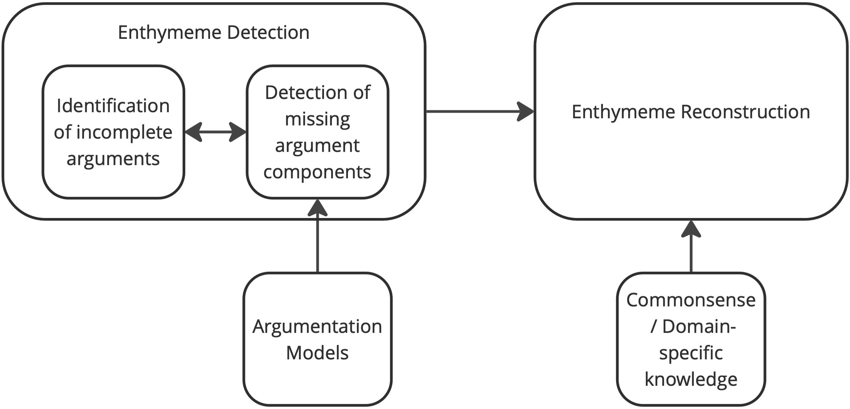 In this section we provide a high-level vision of the process of enthymeme exploration. To analyze and understand enthymemes, it is essential to follow key steps that allow to identify implicitness, to clarify reasons of omissions and to restore reasoning behind an incomplete argument. An overview of this process is represented in the pipeline (Figure 1). The process consists of two main steps or tasks: Enthymeme detection and enthymeme reconstruction.11,12 The goal of the first task is to identify incomplete arguments and define missing components in them. Given an argument with (a) missing component(s), the goal of the second task is then to reconstruct the component(s) that fill the gap. In general, enthymeme detection is perceived as a single-step task, where identifying missing argument components automatically determines the argument as an enthymeme.10,13 To effectively detect missing argument components, we need to apply a specific argumentation model to this step. However, we assume that identifying an argument as incomplete can be a distinct preliminary step, preceding the detection of its implicit components. This initial step involves evaluating argument quality, naturalness, and argumentativeness to determine incompleteness before analyzing the argumentative structure. 12 Such approach allows for a two-step process, (i) identifying incomplete arguments and (ii) detecting implicit argument components. While this flow is logical, it is still equally reasonable to detect missing components directly, since it allows to classify an argument as an enthymeme. At the same time, the second block of the pipeline, enthymeme reconstruction, nearly always requires extralinguistic information, such as commonsense knowledge 14 or domain-specific knowledge, as humans share background information for their reasoning. It is significant to note that some works address only the first module of the pipeline,11,15 because enthymeme detection is a complex and versatile process in itself, while other works tackle only the second step as they start reconstruction given an enthymeme.14,16 Addressing the complete pipeline, including both modules, is challenging, but some progress in this direction has also been made. 12 In the following, we will explore all the blocks of the presented pipeline, starting from the introduction of argumentation models employed for the other steps of enthymeme analysis.