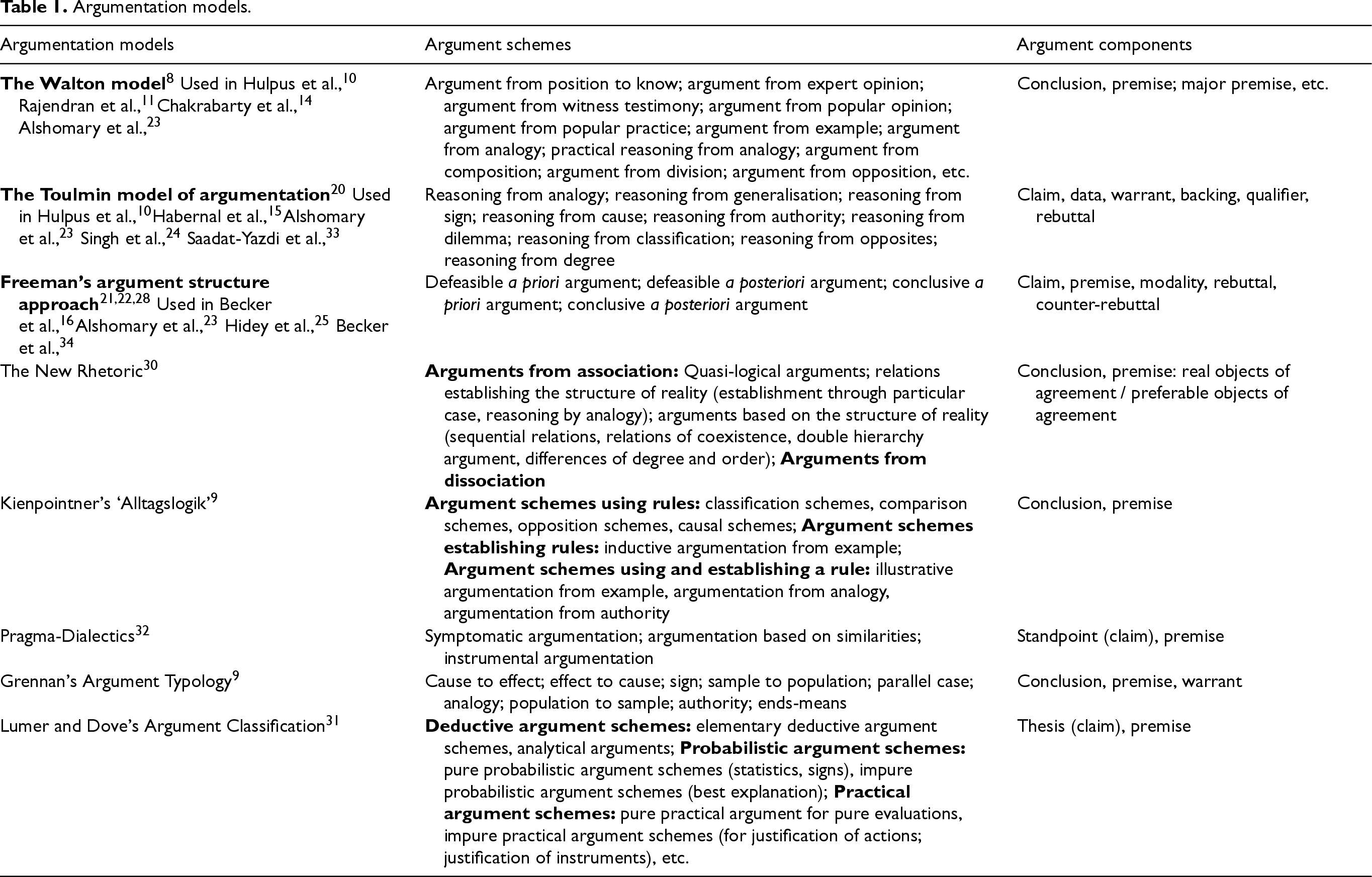 We will now explore specific details of the compilation. First, research on implicit inferences in argumentation mostly references the foundational models of Walton, 8 Toulmin, 20 and the argument structure approach of Freeman.21,22 Studies of implicitness in argumentation typically focus on the components and relations within arguments, aiming to identify omitted argumentative discourse units 18 that need reconstruction. Walton, Toulmin, and Freeman’s models are particularly valuable here, as they all centre on a core structure of argumentation – a conclusion (claim) supported or attacked by evidence (premises) – though each model circumstantiates these components in a distinct way. To illustrate the usability of these three models in enthymeme detection and reconstruction, we will explore some examples (full set of papers that refer to one or another argumentation model is presented in the first column of the Table 1). The Walton model, for instance, is addressed by Rajendran et al. 11 and Chakrabarty et al. 14 for the detection and reconstruction of implicit premises, while Alshomary et al. 23 exploit it for detection and further generation of implicit claims. Several authors15,24 use the model of Toulmin to explore implicit warrants. In this context, the Toulmin Model of argumentation serves the intended purpose due to its granularity. In the meantime, Becker et al. 16 resort to the argument structure approach of Freeman so as to annotate newly generated arguments with argument components and relations according to Freeman’s approach. Hidey et al. 25 reference Freeman’s approach as they apply semantic types of claims proposed in Freeman’s taxonomy 26 to their dataset. All in all, the research centred around implicitness in argumentation (i) utilizes only three major argumentation models, those of Walton, Toulmin and Freeman; (ii) exploits only argument components and relations, keeping aside argument schemes.