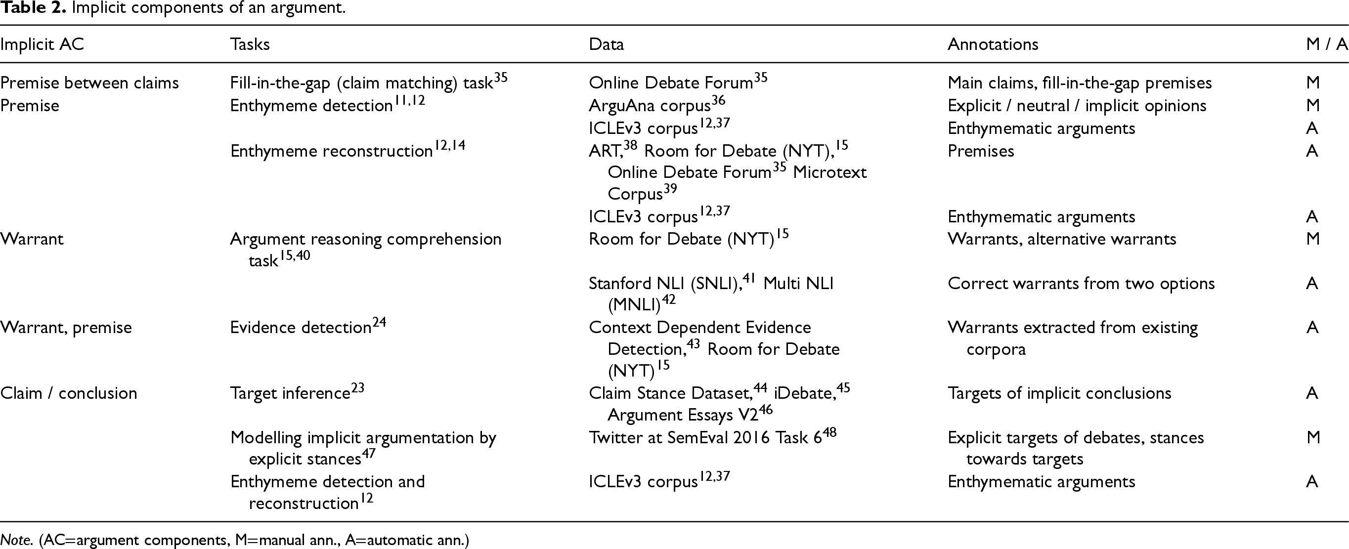 The foundation for developing robust computational approaches to study implicitness in argumentation begins with manual annotations. Early research in enthymeme analysis relied heavily on manual annotation of argument components,25,35 stances in opinions, 11 stances towards targets, 47 reasons, 15 and commonsense relations. 16 Also, before the adoption of automatic techniques, researchers focussed on preliminary manual approaches to simulate automatic analysis. These included manual classification of argument components into semantic types, 25 manual reconstruction of implicit knowledge, 16 manual reconstruction of argument components such as warrants and alternative warrants, 15 human similarity judgment (e.g., semantic similarity between a claim and a major claim). 35 Such foundational steps are crucial for several reasons. First, human-annotated data enables researchers to explore the nature of implicitness, uncovering patterns and features that characterize implicit premises, claims, and warrants, while also providing valuable insights into human reasoning. Additionally, manual analysis serves as the ground truth for evaluating automatic approaches. Finally, it demonstrates the feasibility of tasks related to implicitness and helps identify potential challenges and pitfalls for future automatic analysis.