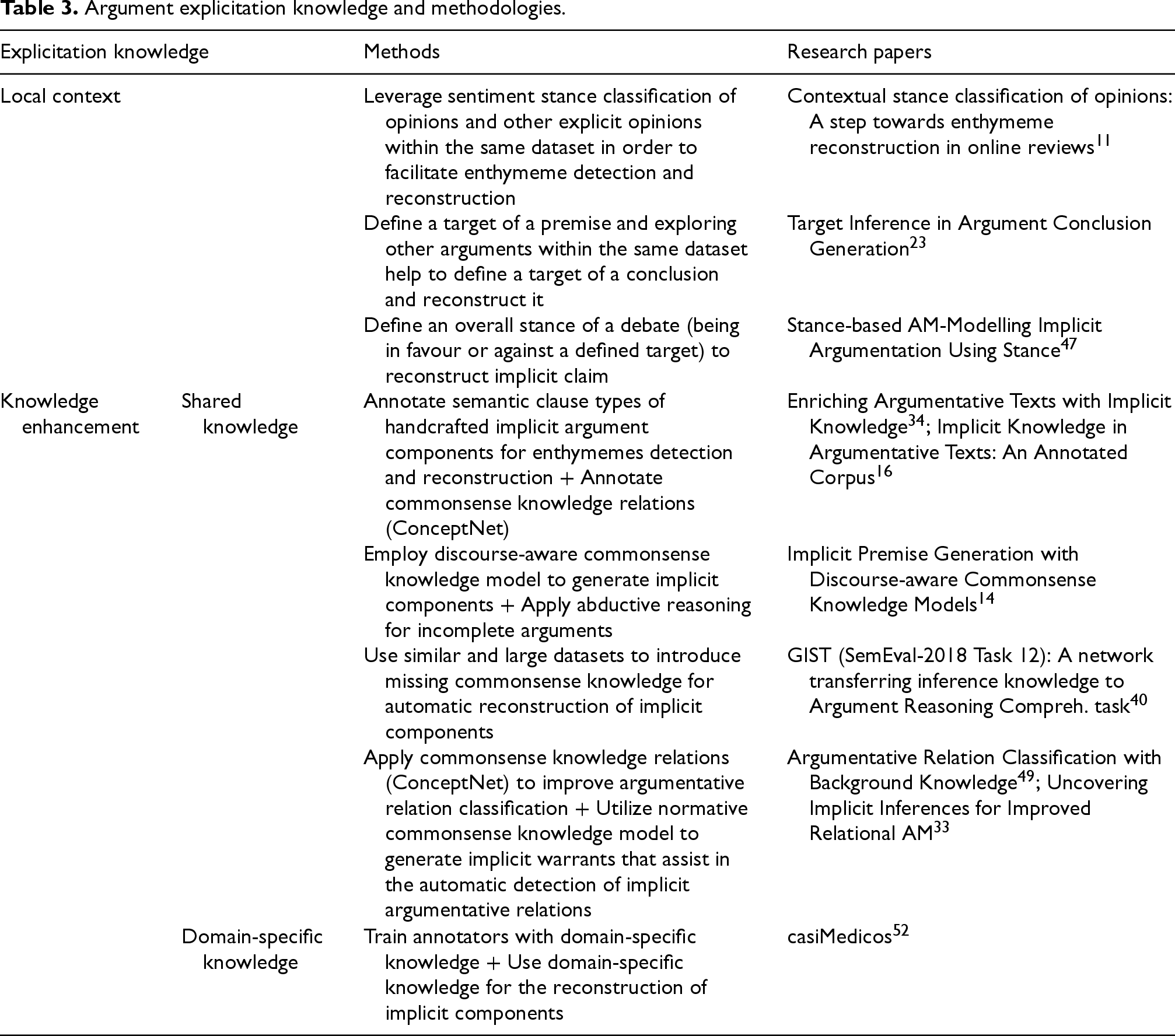 The exploration of argument explicitation unfolds along two research directions: (i) Some works assert that the contextual information surrounding an argument may be sufficient to restore its implicit components, facilitating argument understanding; (ii) in contrast, alternative studies emphasize the necessity of additional knowledge beyond the argument context. This additional knowledge encompasses both universally shared commonsense knowledge and domain-specific knowledge inherent to a particular field. As mentioned by Lauscher et al., 7 argument reasoning is highly dependent on commonsense and domain-specific knowledge, therefore, this approach seems sound. While these two directions are shortly described by Becker et al., 34 we propose a thorough analysis in the following (see Table 3).