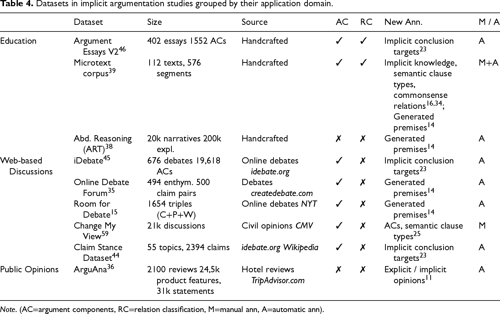 This section presents a compilation of datasets used in implicit argumentation studies (see Table 4), selected for their relevance to AM and reasoning. The table provides details about each dataset’s size, source, original annotations (whether argument components and/or relations are labelled), and additional annotations introduced in subsequent works, highlighting the methodology used for annotation collection (manual or automatic). As well as that, the datasets are grouped according to their application domains: education, web-based discussions, public opinions.