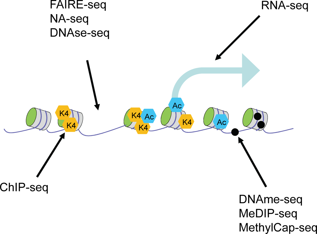 Current technology allows for the first time the comprehensive mapping of all different aspects of the epigenome: ChIP-seq can be used to examine histone modifications at the genome-wide level, RNA-seq for profiling the transcriptome, and a variety of techniques are available to examine global accessibility and the DNA methylome (Fig. 2). An important consideration for epigenome analysis is the establishment of standard operating procedures (SOP) that allow data of the highest quality to be generated and compared through similar efforts among different consortia. Currently, IHEC, an international consortium that sets out to establish high-resolution reference epigenome maps for the research community, aims to define these standards, not only for data generation but also for data storage and availability. This should be the primary guideline for every effort into epigenome generation throughout the world.