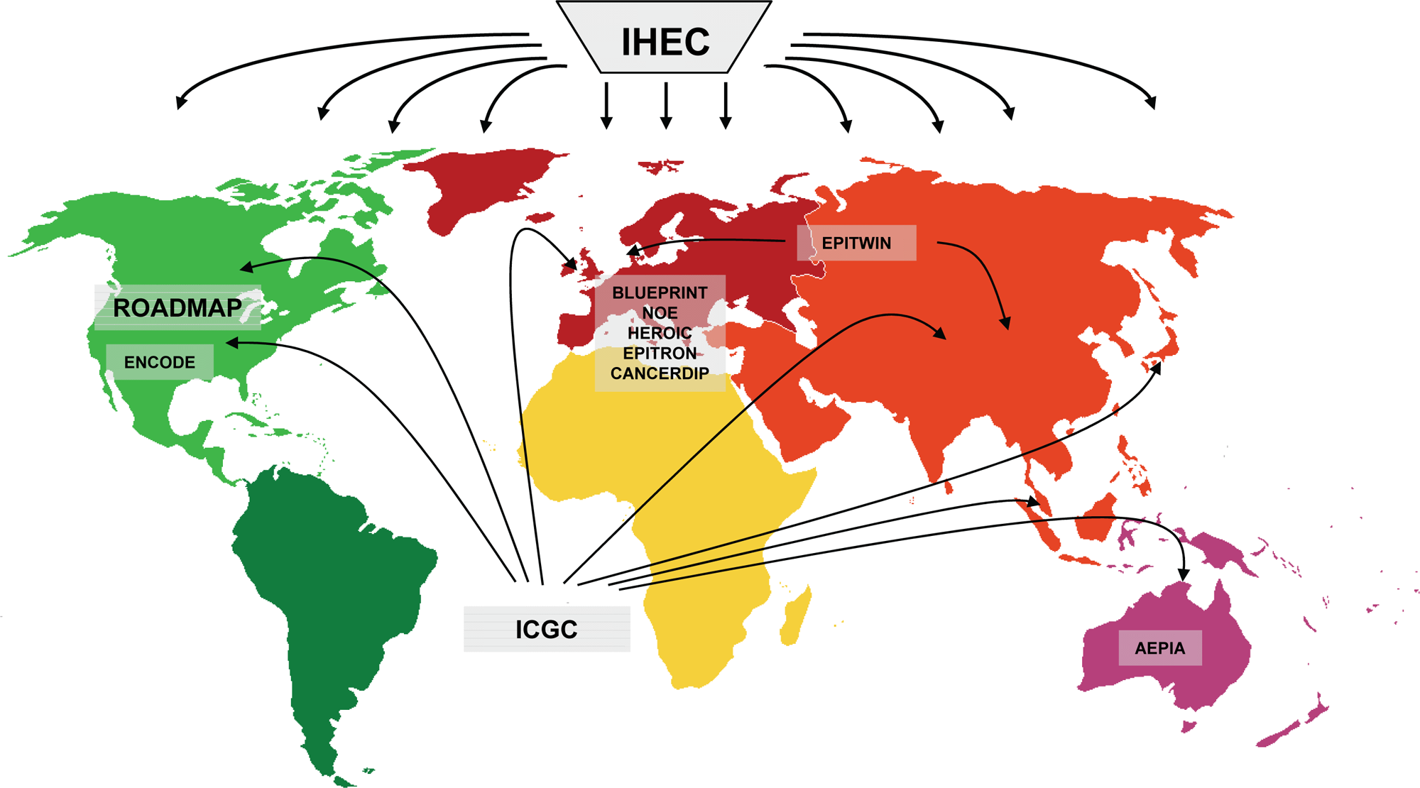 The field of epigenetics has expanded over the last decade, and the initial small-scale epigenetic efforts at the beginning of the century were soon followed by the initiation of large epigenetic consortia that set out to understand the wealth of information stored in the epigenome. Most of these consortia had a strong epigenetic/ epigenomic component and focused on subsets of epigenetic modifications (such as DNA methylation) as well as on other biological aspects. With the arrival of new sequencing technologies, the aim of more recent projects has shifted toward mapping full epigenomes as the major objective. Clearly, these efforts require substantial resources, and as a result, the need for collaboration has grown. Indeed, initially, most projects were initiated at a national or continental level, while more recently, efforts have extended toward intercontinental collaborations (Fig. 3). As such, it is clear that mapping the epigenome is really a global effort.