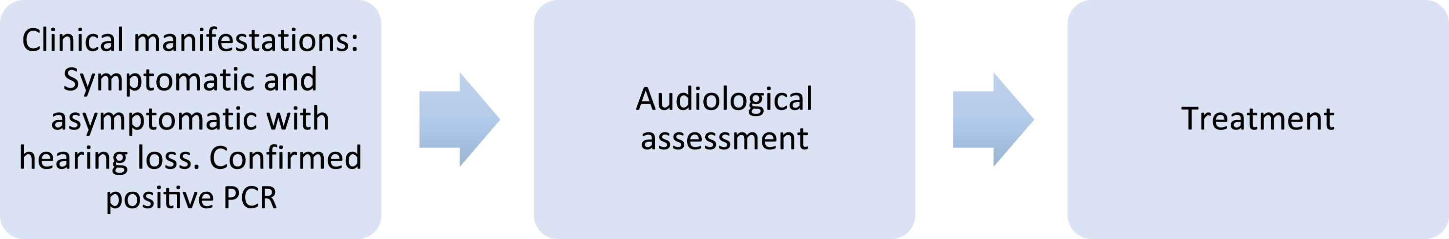 Due to limited studies of SARS-CoV-2 on the auditory system, SSNHL could be treated as a non-specific symptom of SARS-CoV-2 and this may lead to a delay in treatment. As effective treatment for SSNHL has a narrow therapeutic window, further studies to determine whether SARS-CoV-2 is correlated with hearing loss are warranted. Nonetheless, the current literature review highlights the possible relationship between SARS-CoV-2 and hearing loss and may serve as a reference for future work. A simplified process of managing the patients suffering from SARS-CoV-2 and hearing loss is depicted in Figure 1. This may benefit clinicians who can intervene early and manage patients with SARS-CoV-2-induced hearing loss as we know that treatment is time-sensitive to salvage the patient’s hearing. Simplified workflow for managing patients positive for SARS-CoV-2 with suspected hearing loss.
